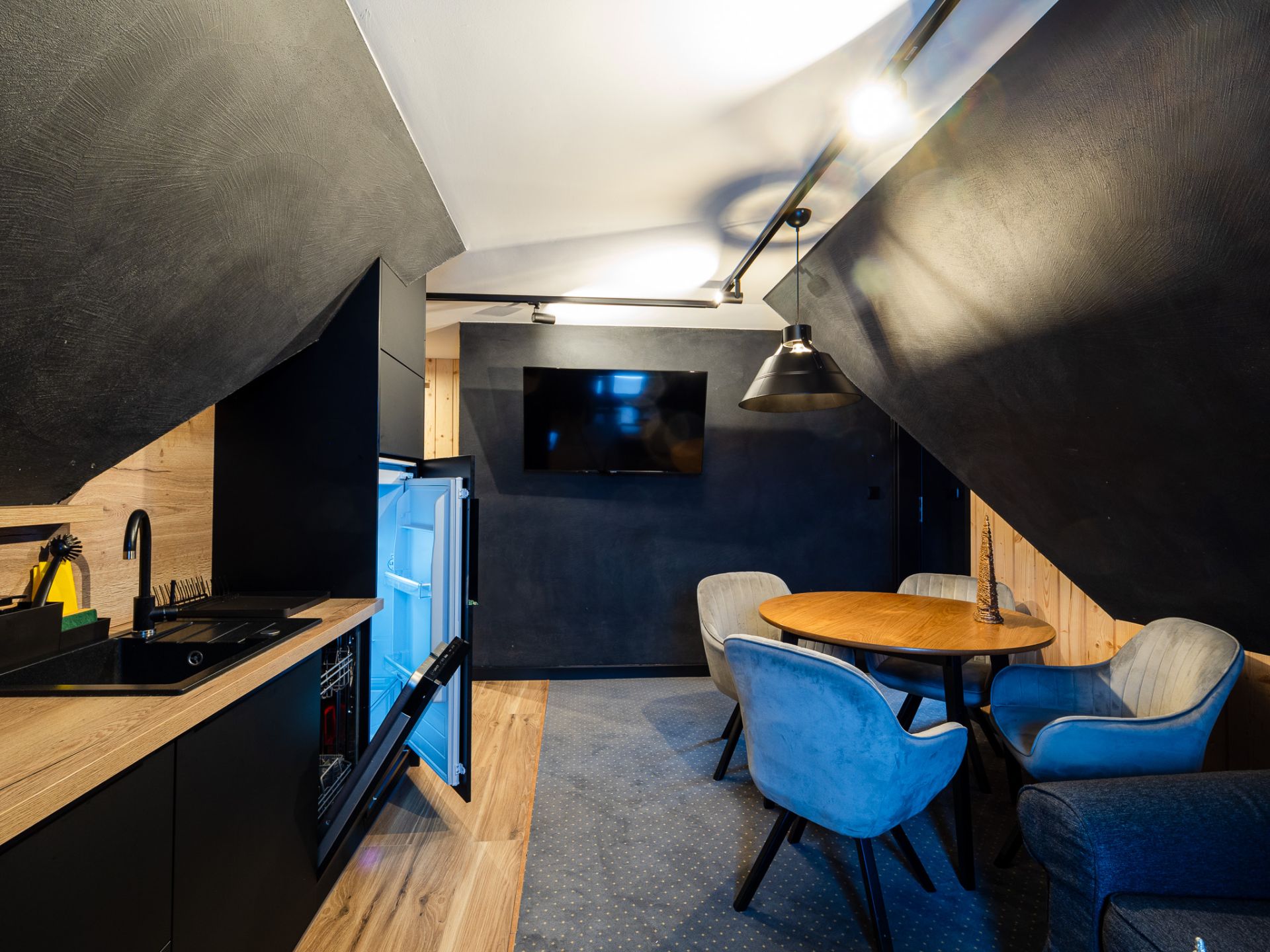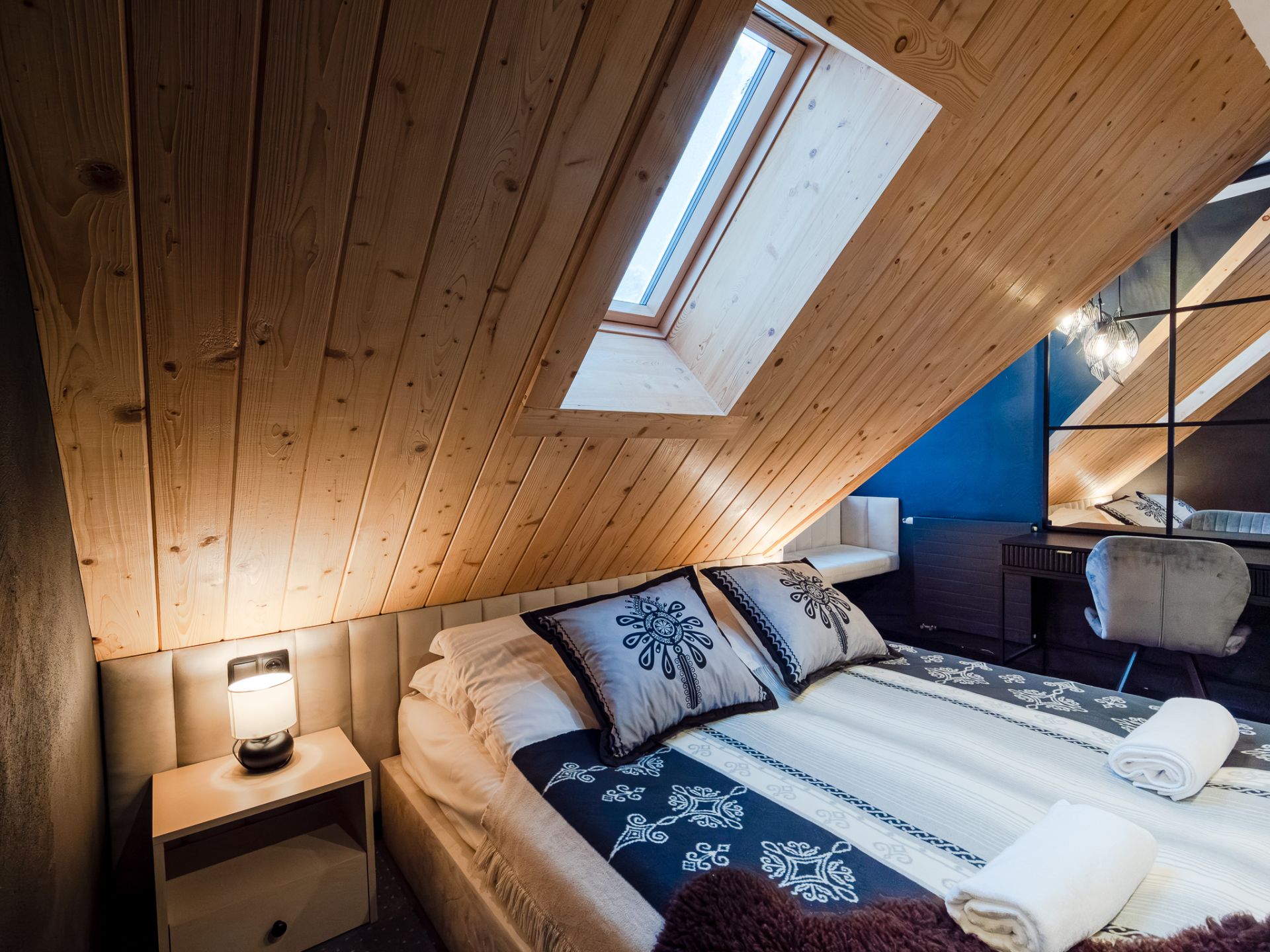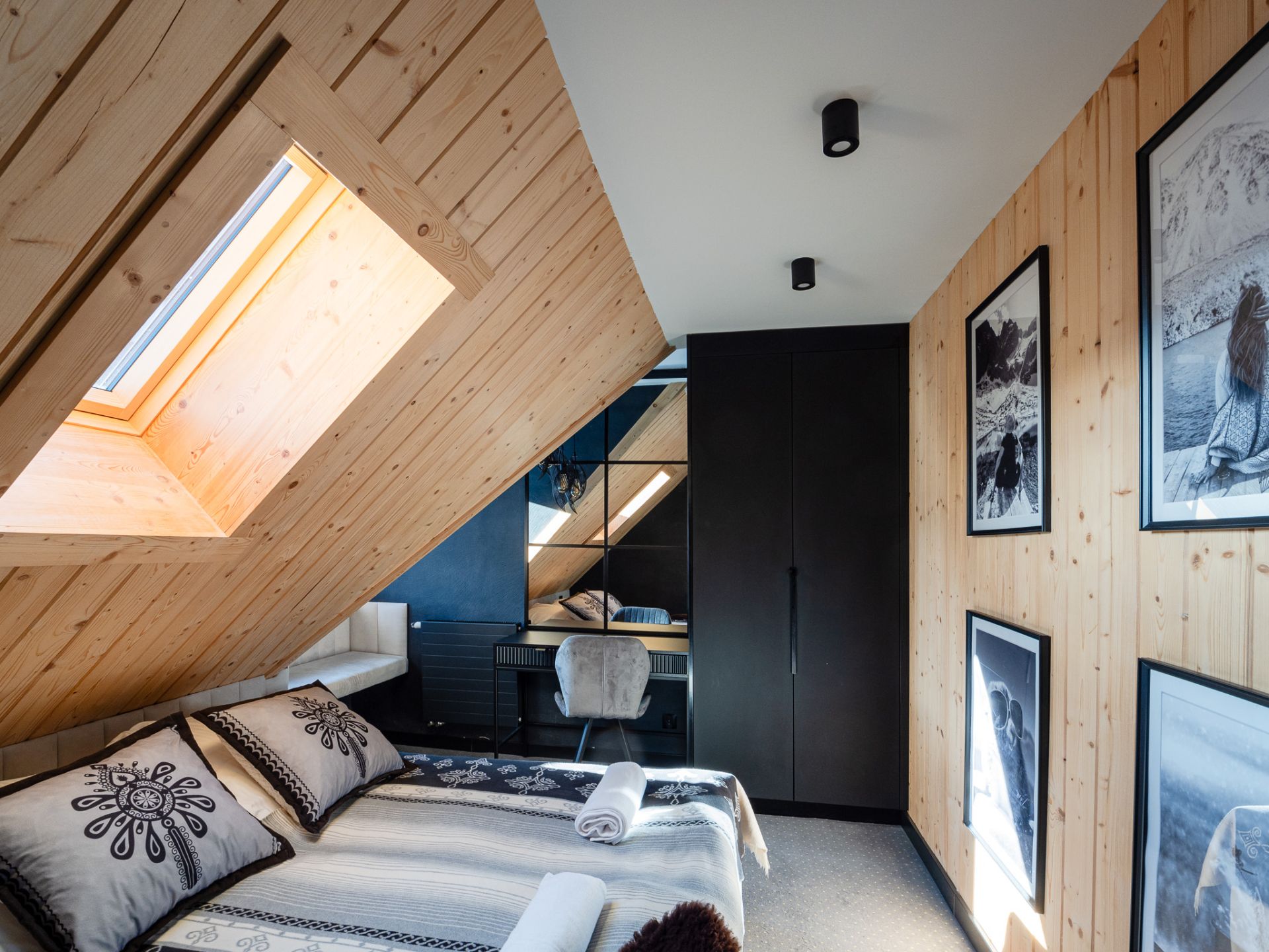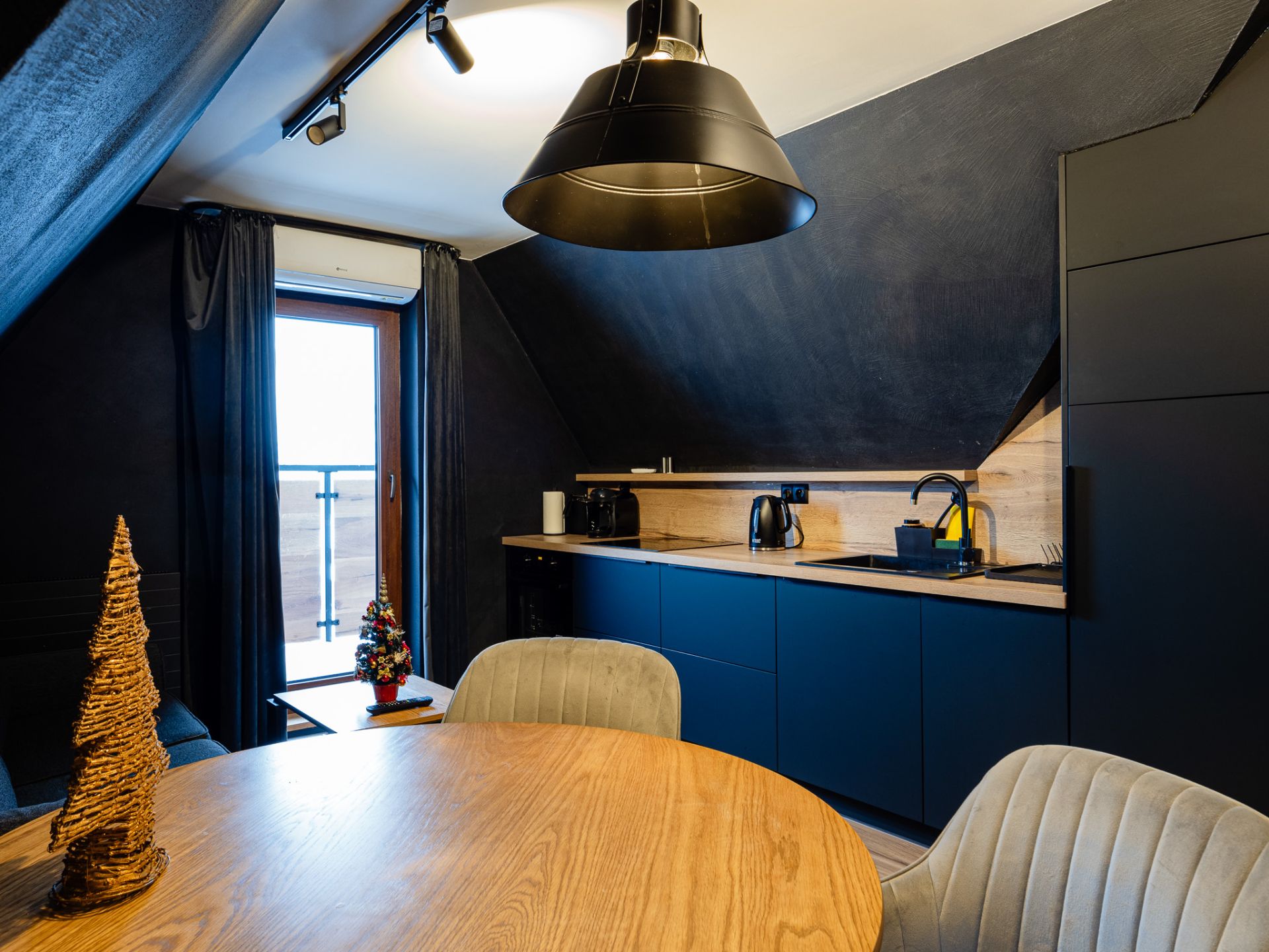 Stylowy apartament na poddaszu w nowoczesnym wykończeniu: czarne akcenty połączone z ciepłym drewnem. Funkcjonalny układ: 1 sypialnia z wygodnym łóżkiem małżeńskim, 2 sypialnia z 2 pojedynczymi łóżkami, salon z rozkładaną sofą i stołem, w pełni wyposażony aneks kuchenny, łazienka z prysznicem typu walk-in. Dodatkowym atutem jest praktyczna pralnia/schowek – idealne rozwiązanie na dłuższe pobyty. Komfortowy wybór dla par, rodzin (4–5 osób ) ceniących design i wygodę.