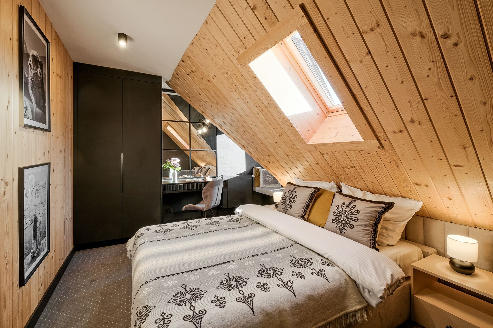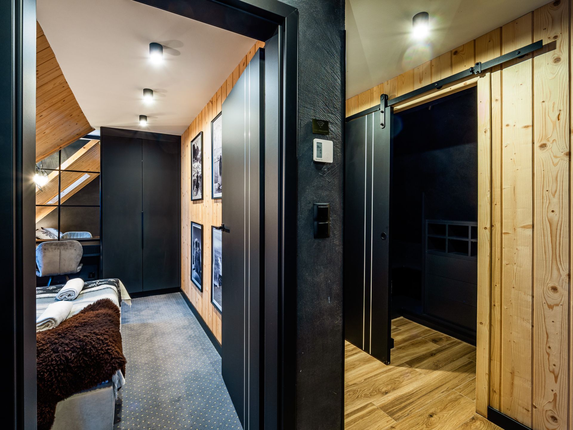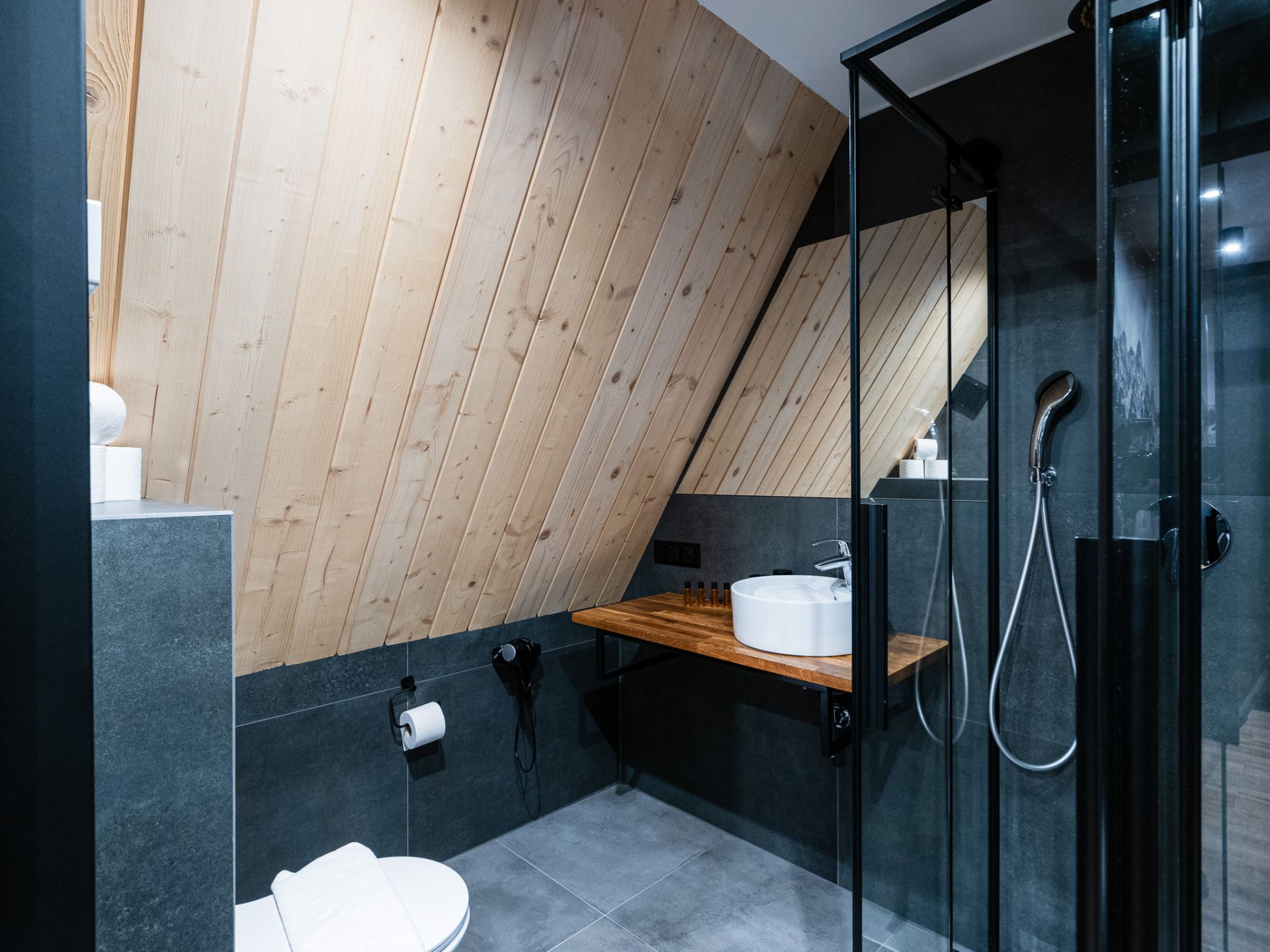 Stylowy apartament na poddaszu w nowoczesnym wykończeniu: czarne akcenty połączone z ciepłym drewnem. Funkcjonalny układ: 1 sypialnia z wygodnym łóżkiem małżeńskim, 2 sypialnia z 2 pojedynczymi łóżkami, salon z rozkładaną sofą i stołem, w pełni wyposażony aneks kuchenny, łazienka z prysznicem typu walk-in. Dodatkowym atutem jest praktyczna pralnia/schowek – idealne rozwiązanie na dłuższe pobyty. Komfortowy wybór dla par, rodzin (4–5 osób ) ceniących design i wygodę.