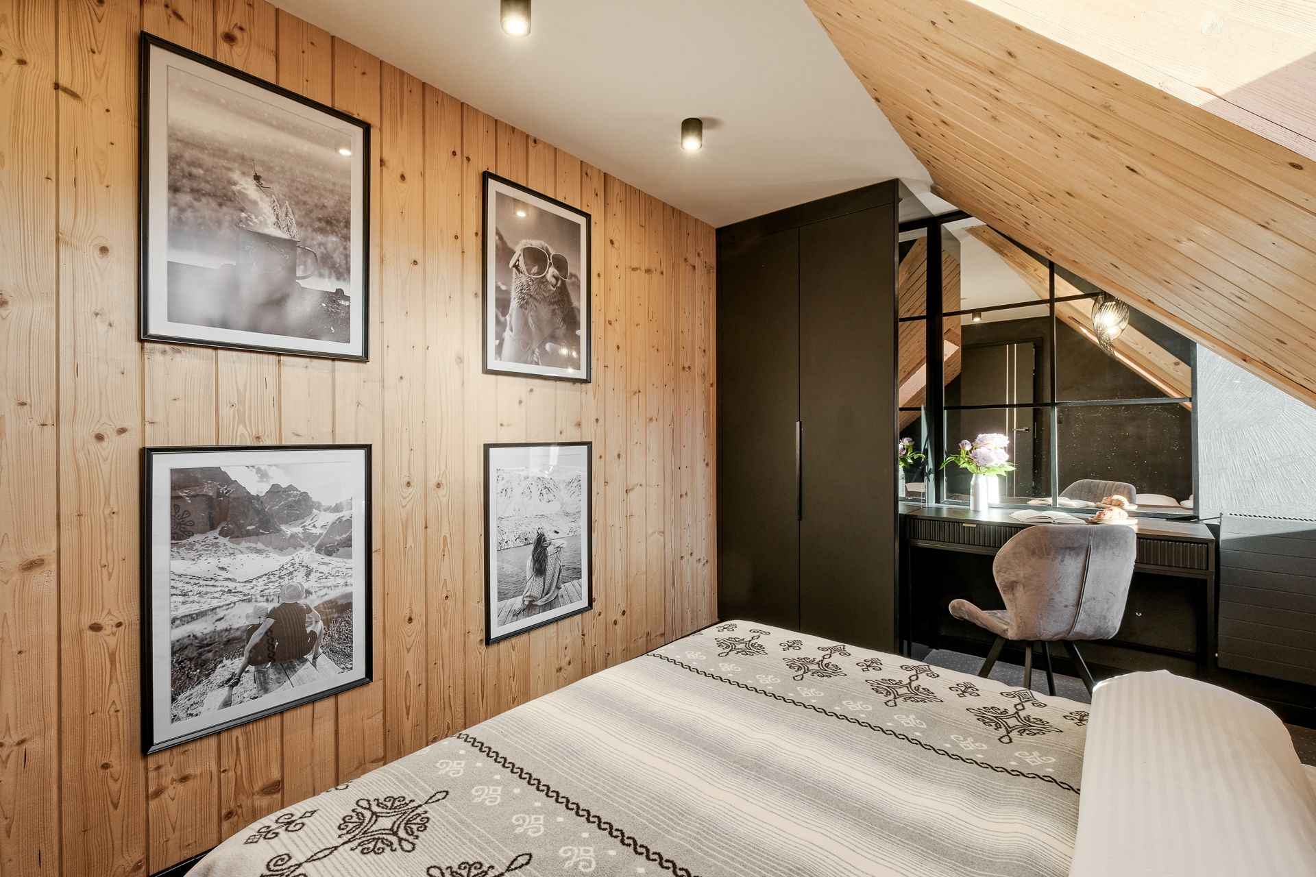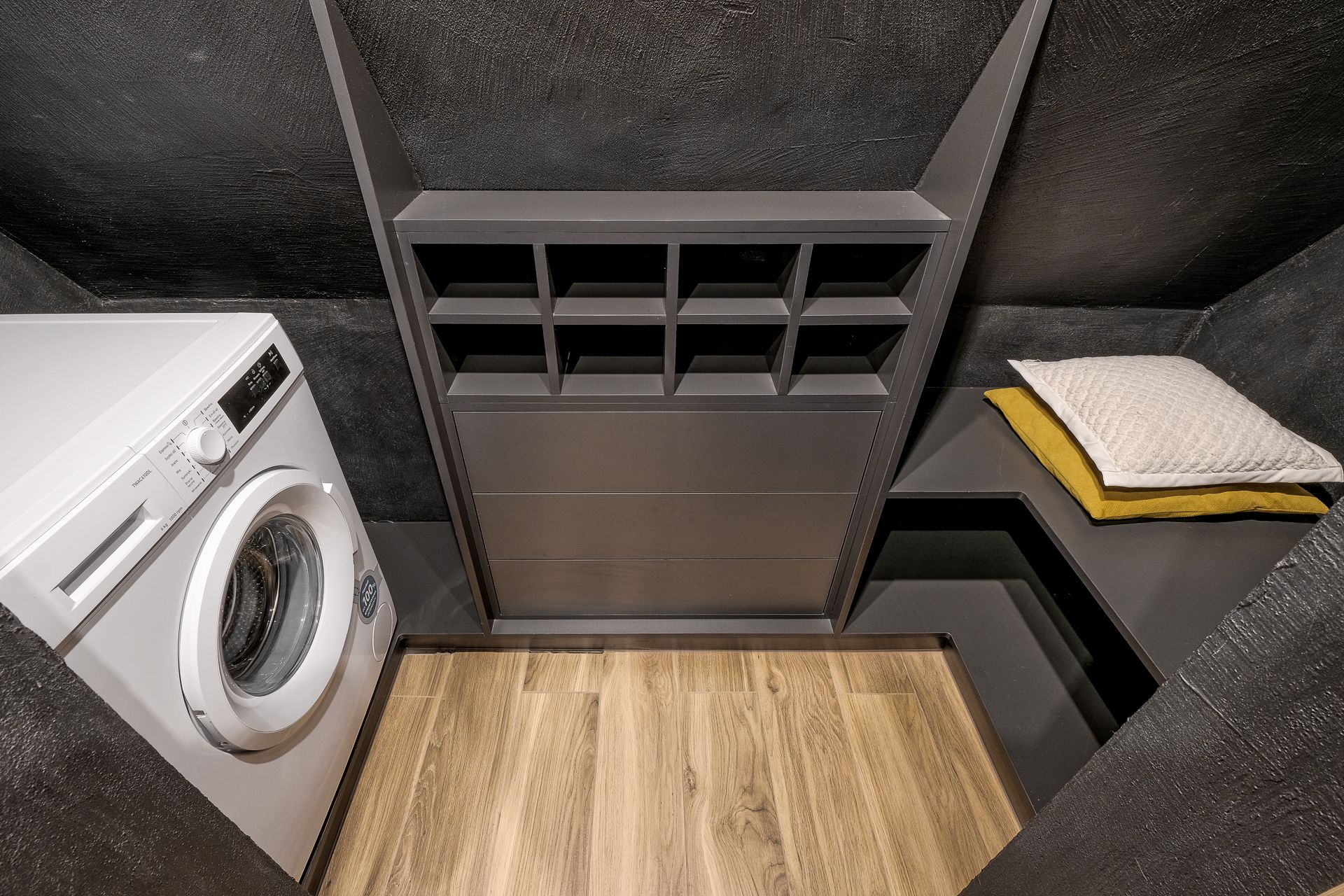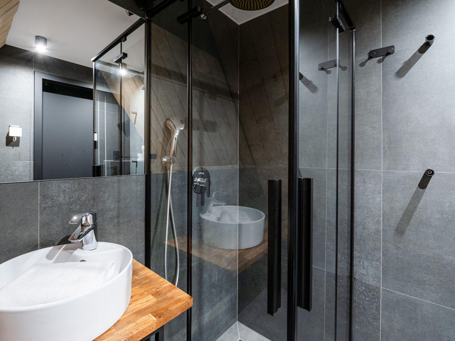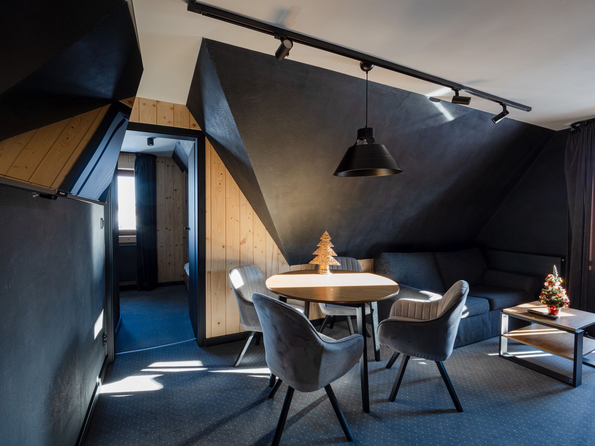 Stylowy apartament na poddaszu w nowoczesnym wykończeniu: czarne akcenty połączone z ciepłym drewnem. Funkcjonalny układ: 1 sypialnia z wygodnym łóżkiem małżeńskim, 2 sypialnia z 2 pojedynczymi łóżkami, salon z rozkładaną sofą i stołem, w pełni wyposażony aneks kuchenny, łazienka z prysznicem typu walk-in. Dodatkowym atutem jest praktyczna pralnia/schowek – idealne rozwiązanie na dłuższe pobyty. Komfortowy wybór dla par, rodzin (4–5 osób ) ceniących design i wygodę.