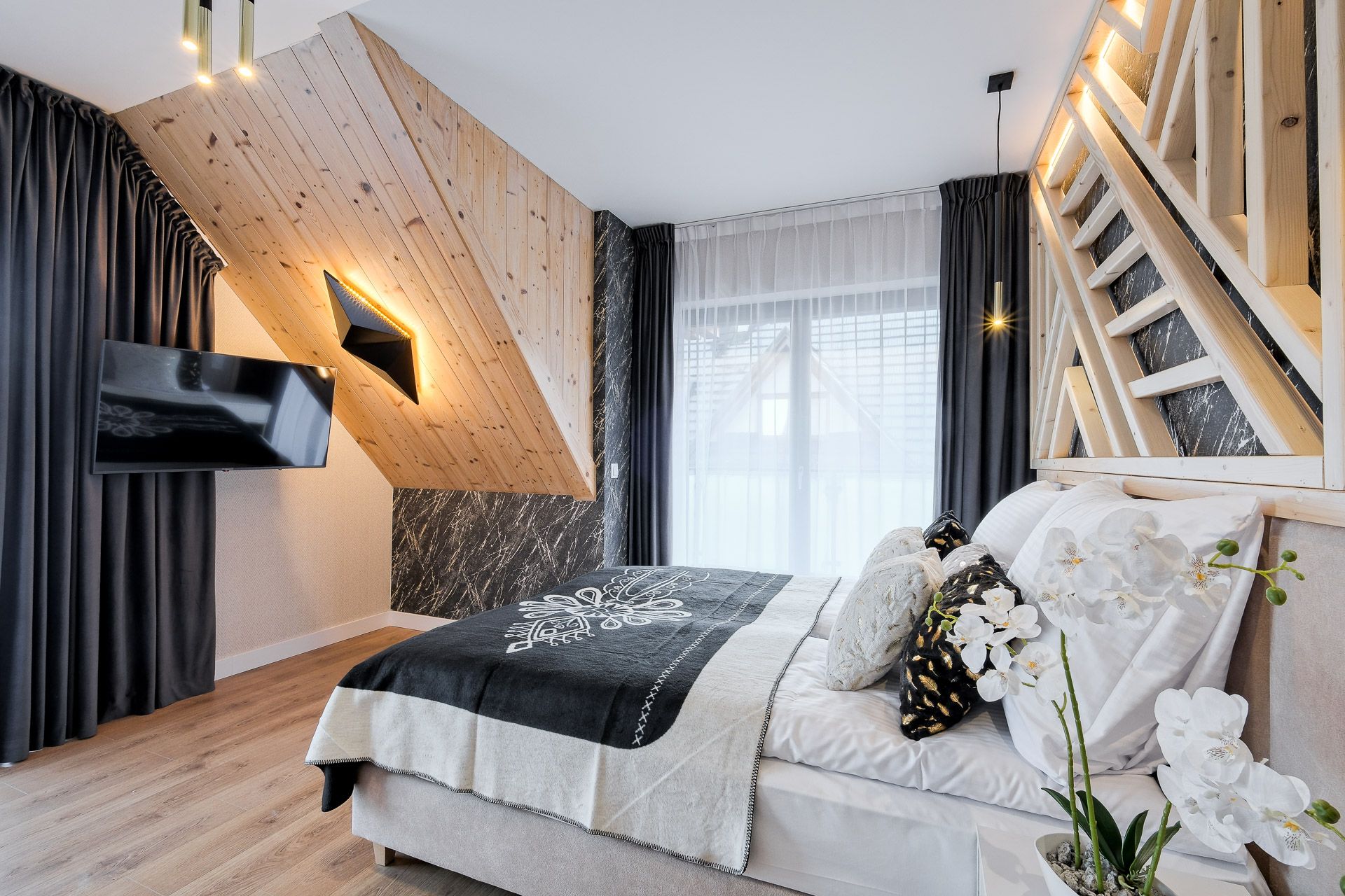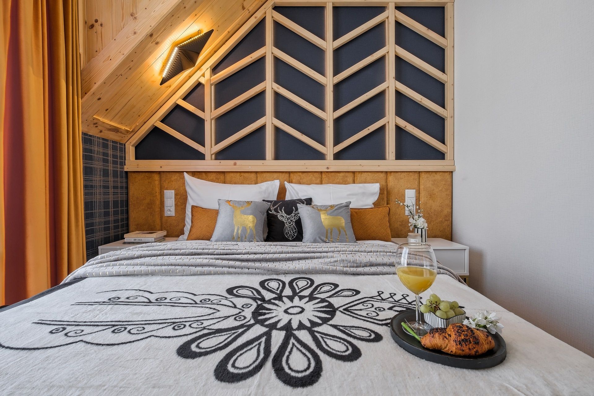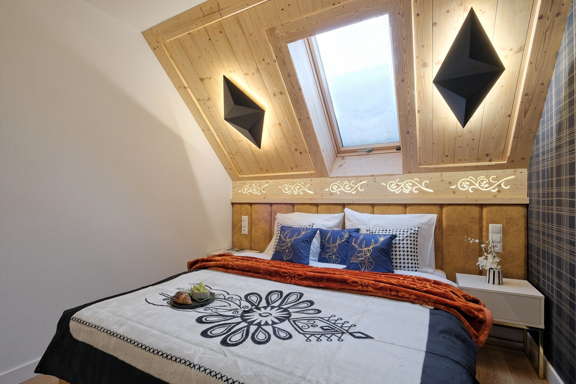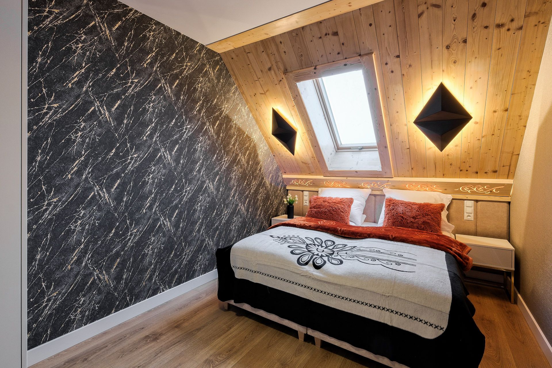 Każda sypialnia została zaprojektowana w unikalnym stylu, z wykorzystaniem ciepłego drewna, tapicerowanych zagłówków oraz nastrojowego światła. W każdej sypialni znajdują się wygodne łóżka kontynentalne z wysokiej jakości materacami, gwarantujące głęboki i zdrowy sen.
