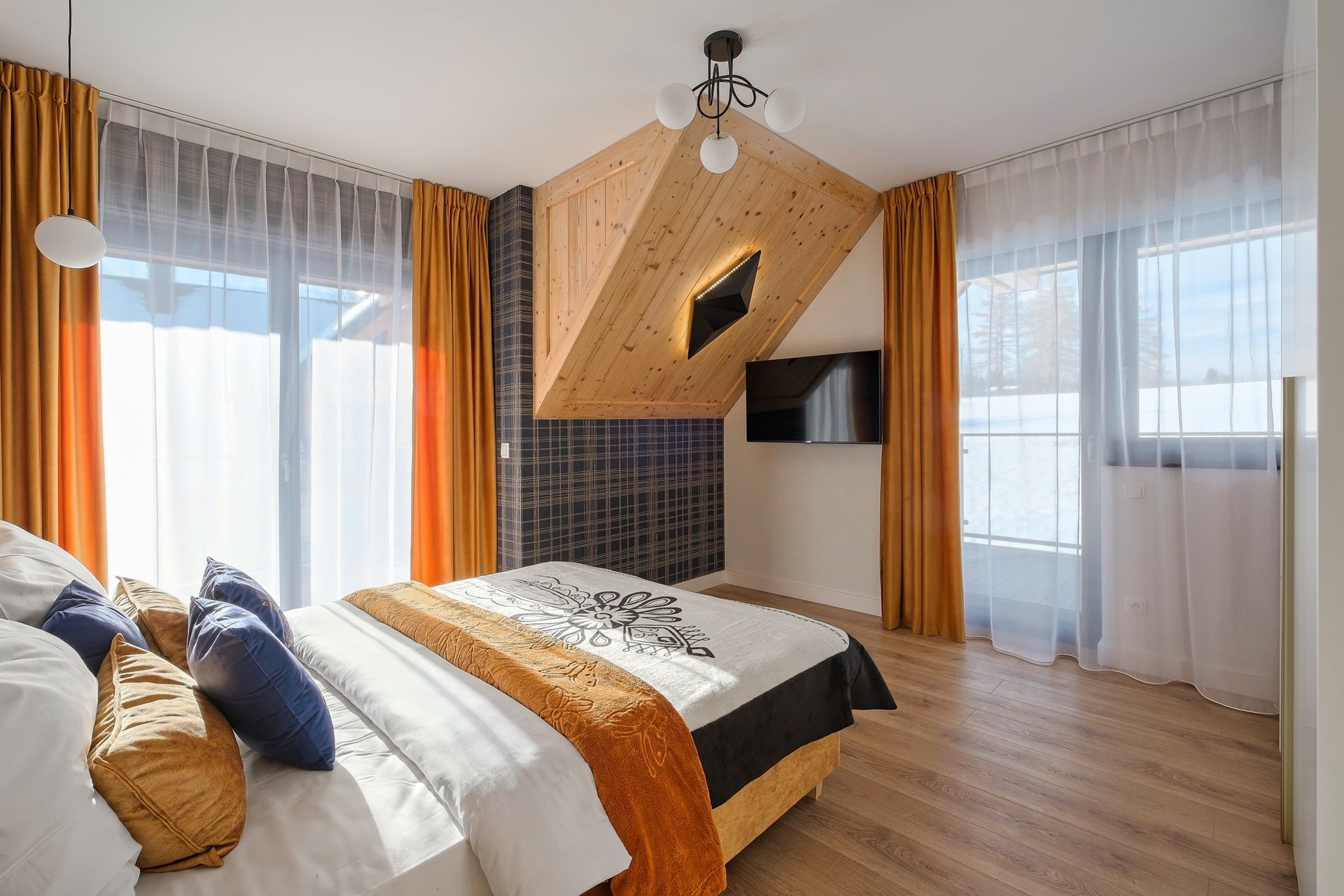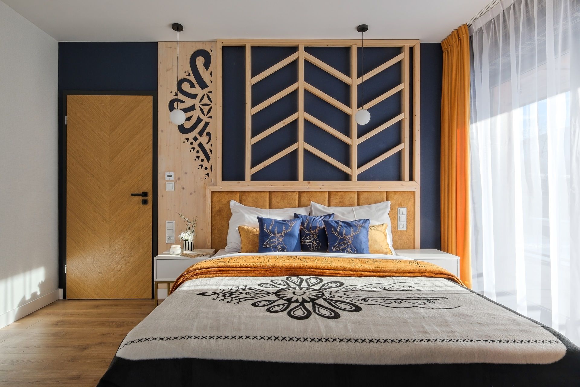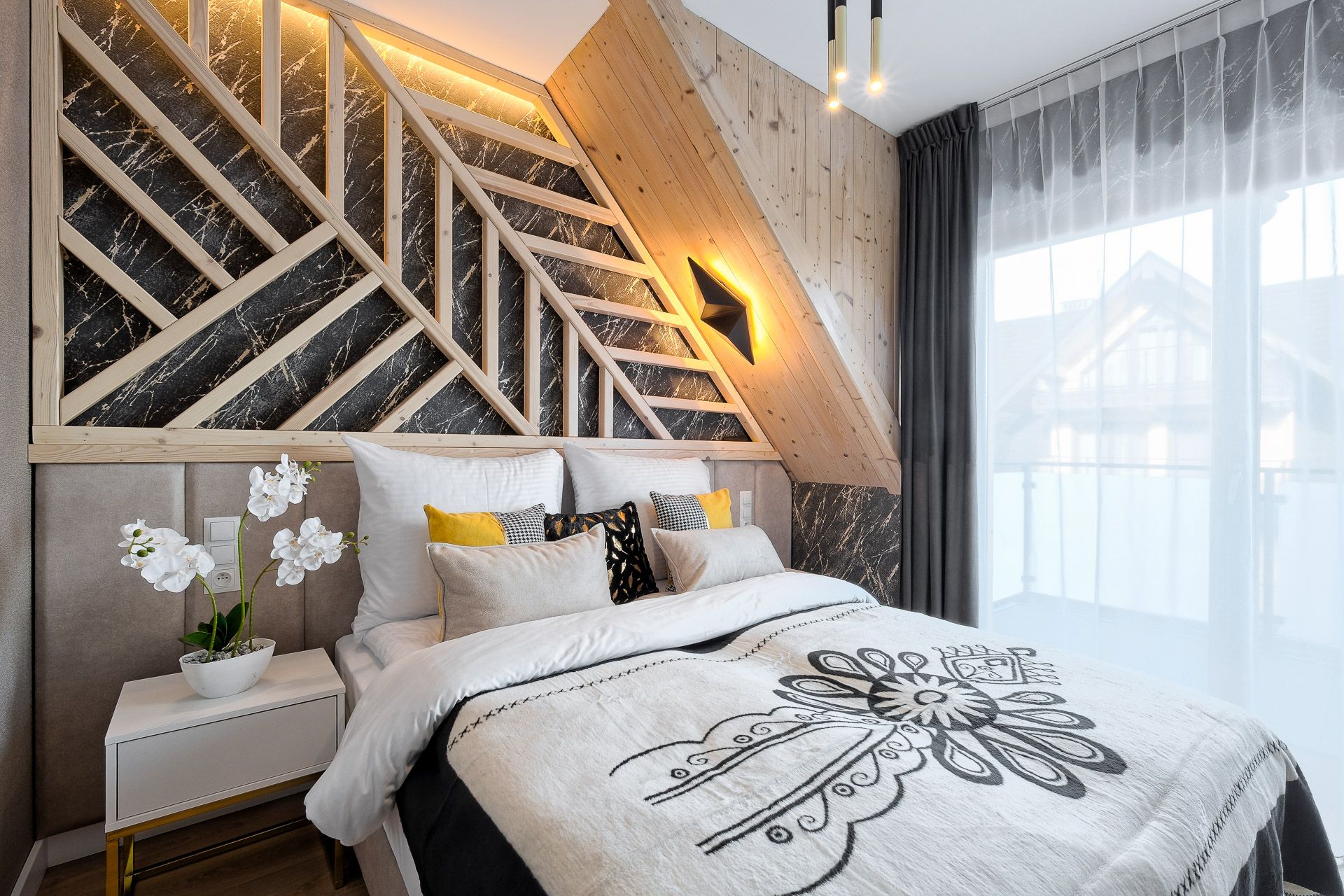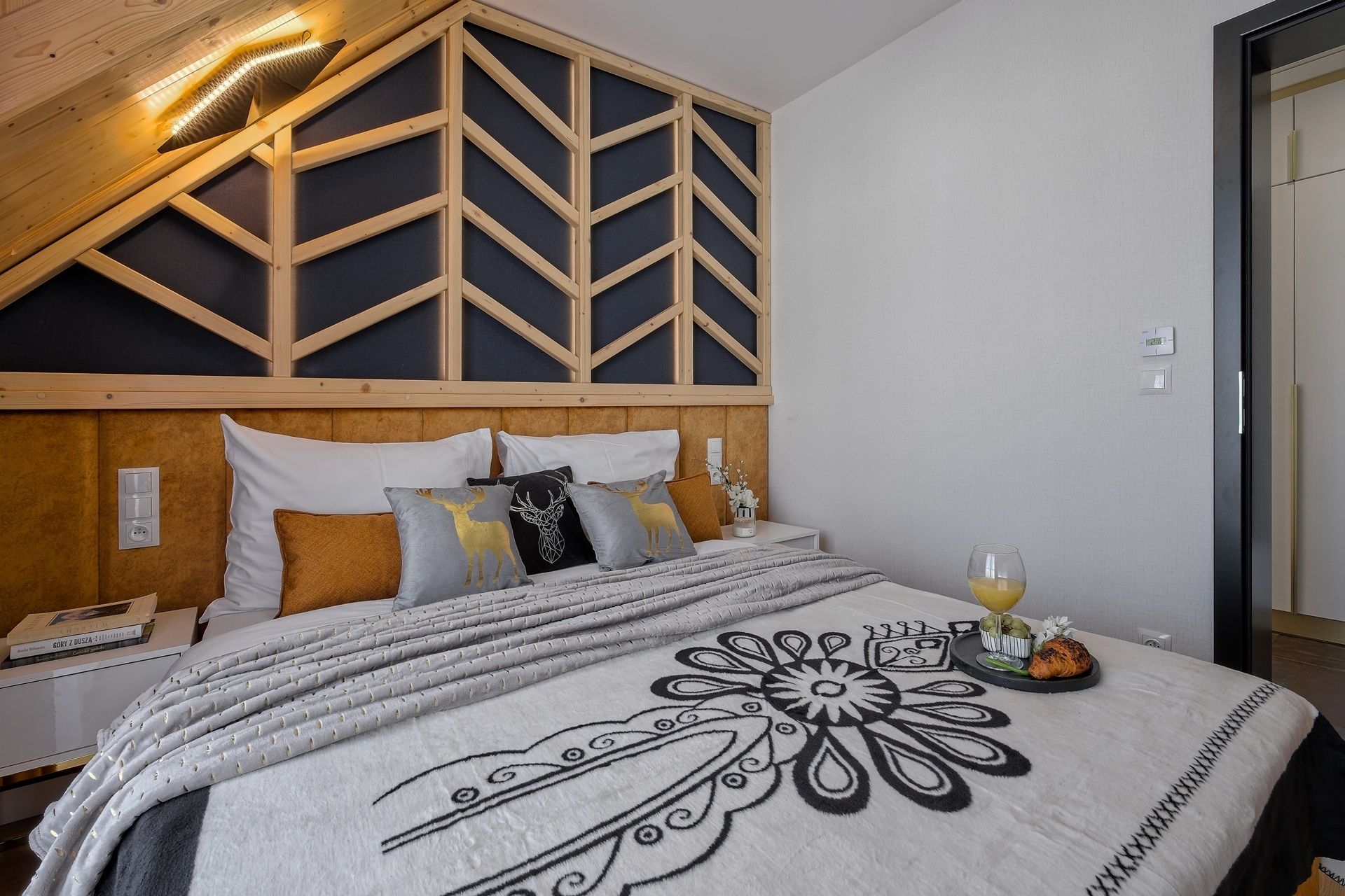 Każda sypialnia została zaprojektowana w unikalnym stylu, z wykorzystaniem ciepłego drewna, tapicerowanych zagłówków oraz nastrojowego światła. W każdej sypialni znajdują się wygodne łóżka kontynentalne z wysokiej jakości materacami, gwarantujące głęboki i zdrowy sen.