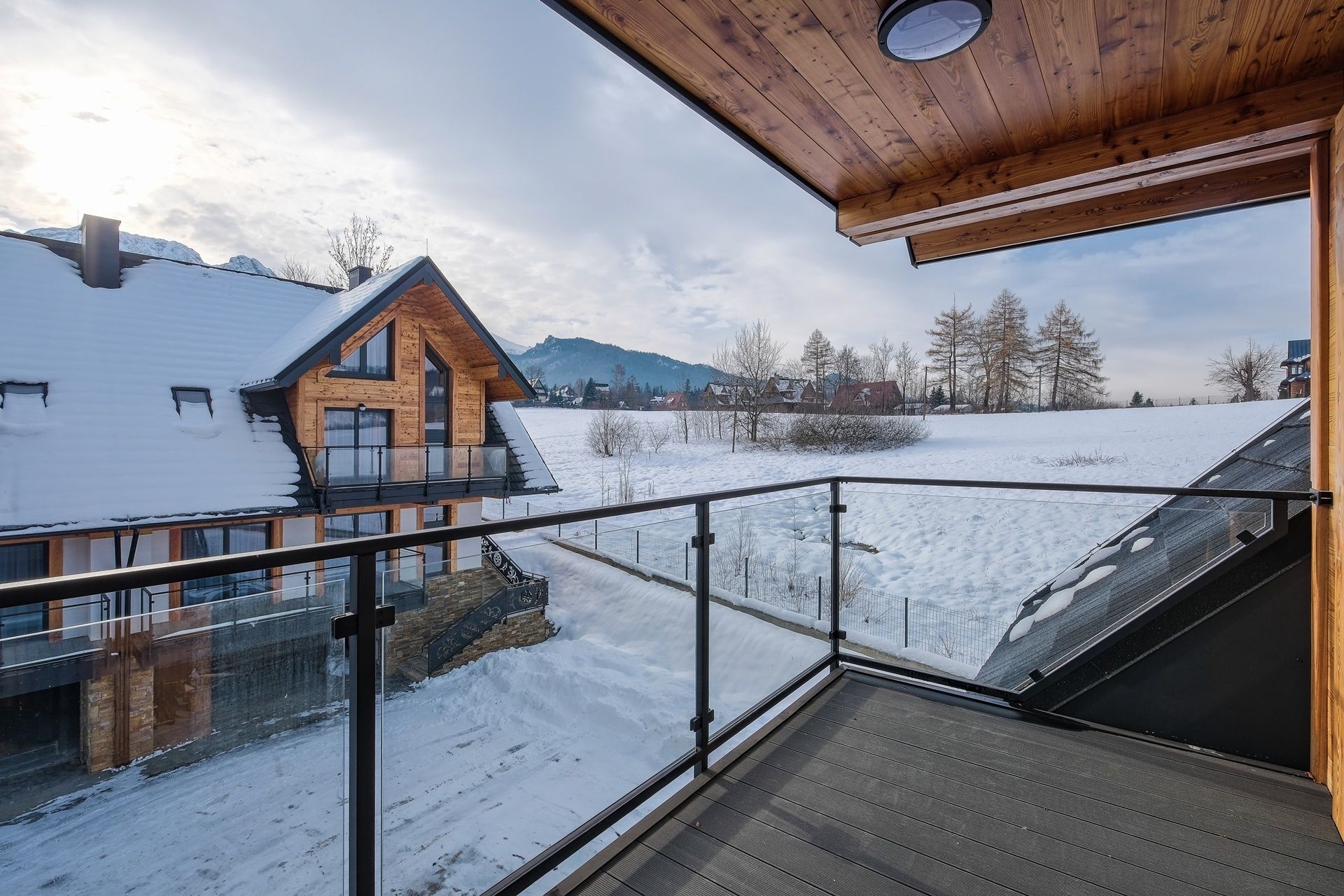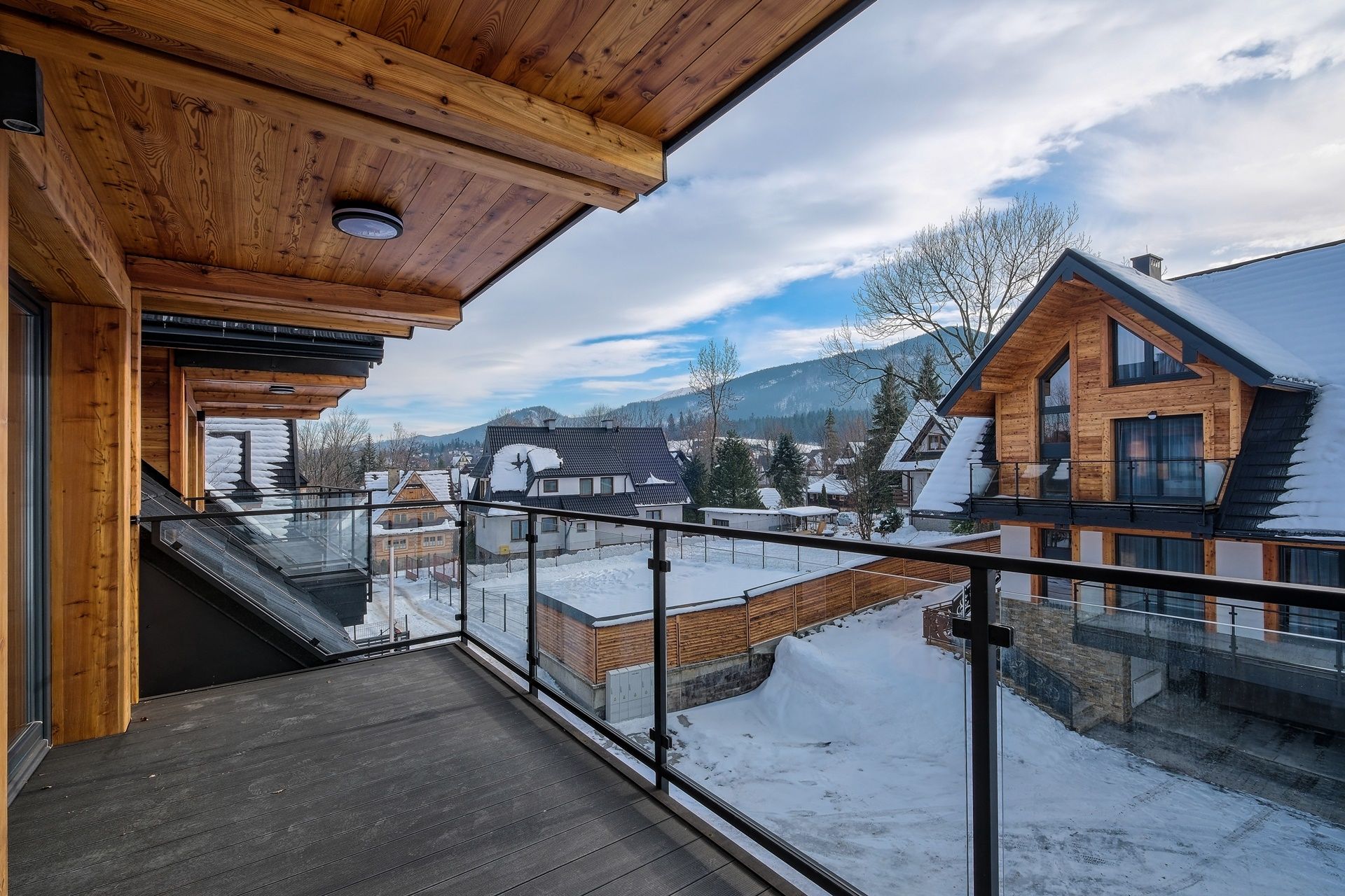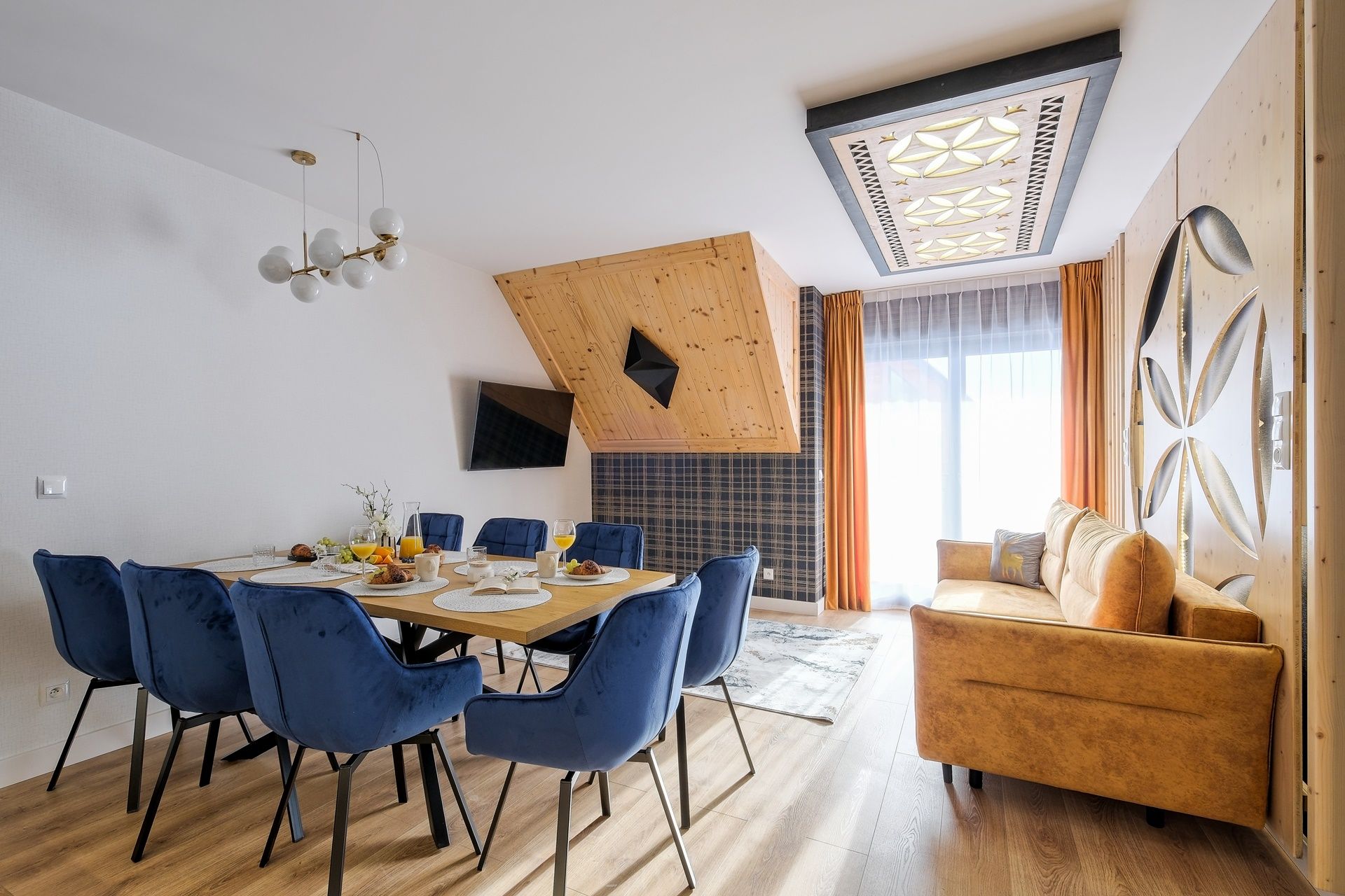 Stylowy salon z designerskimi panelami świetlnymi i dużą, miękką sofą to idealne miejsce na relaks po całym dniu. Z salonu można wyjść na balkon, z którego rozciąga się kojący widok na naturę i góry.