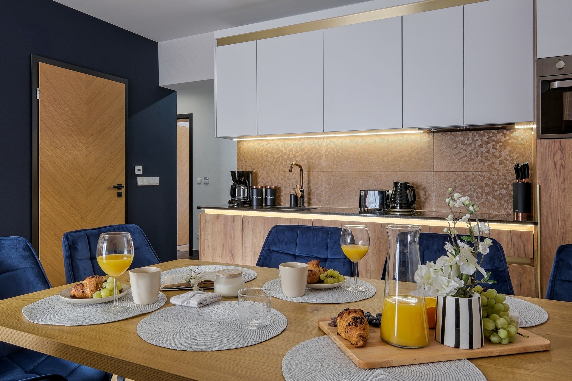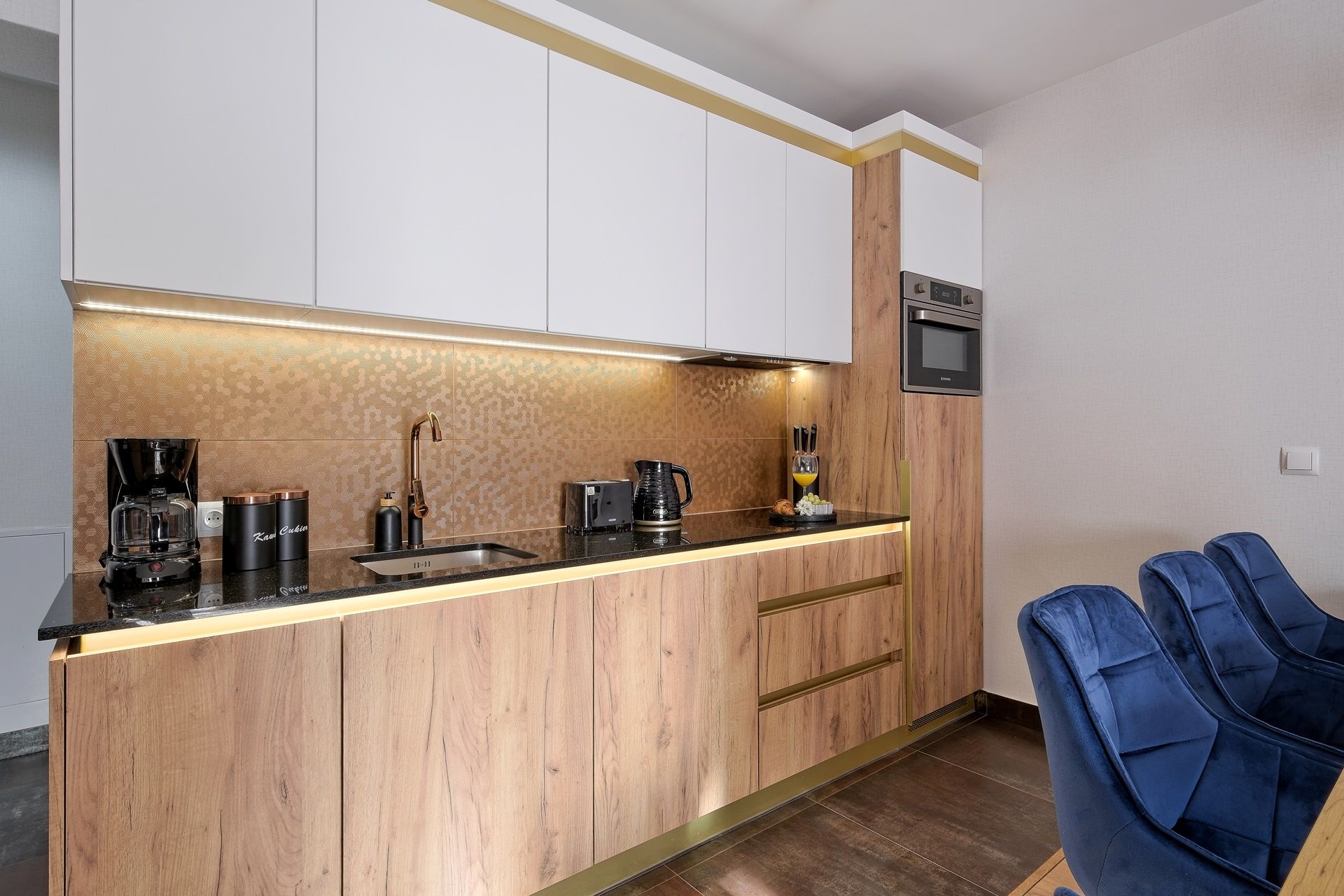 Blaty oraz podświetlenia dodają wnętrzu elegancji i funkcjonalności.