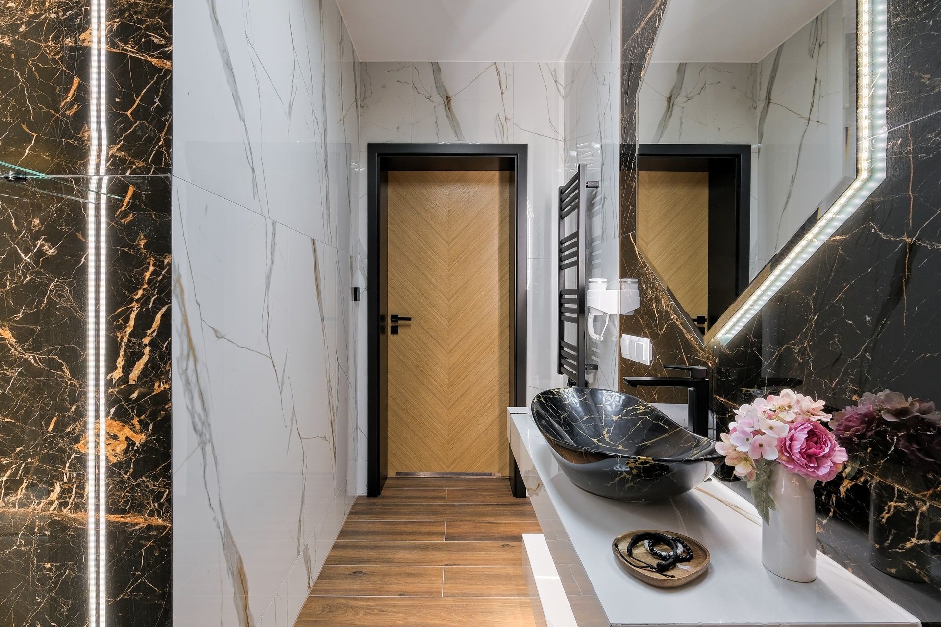 Stylowa łazienka z czarno-złotymi akcentami, podświetlanymi detalami i przestronną kabiną prysznicową typu walk-in. Wysokiej jakości armatura oraz designerska umywalka zapewniają komfort i wyjątkowe wrażenia.