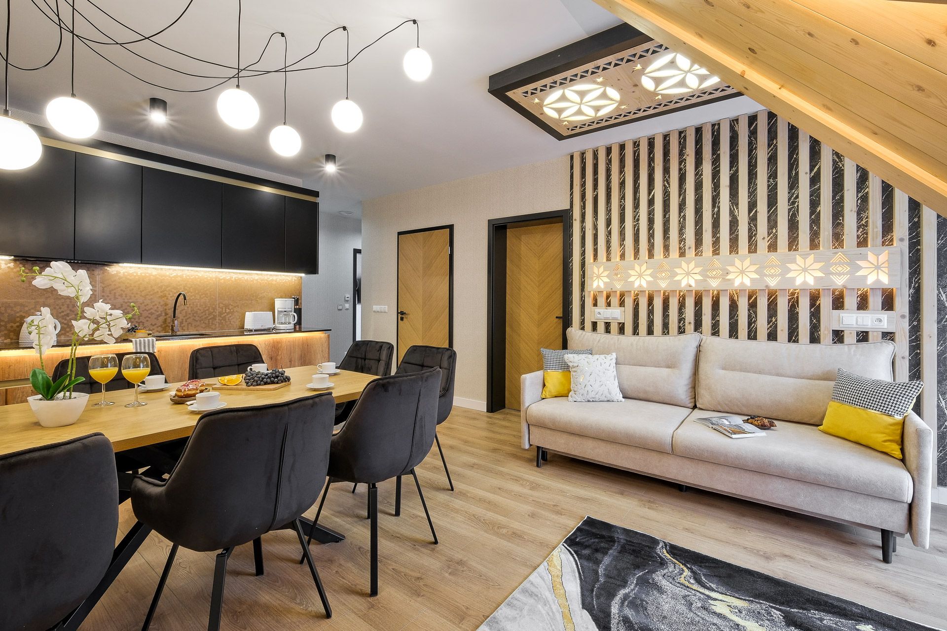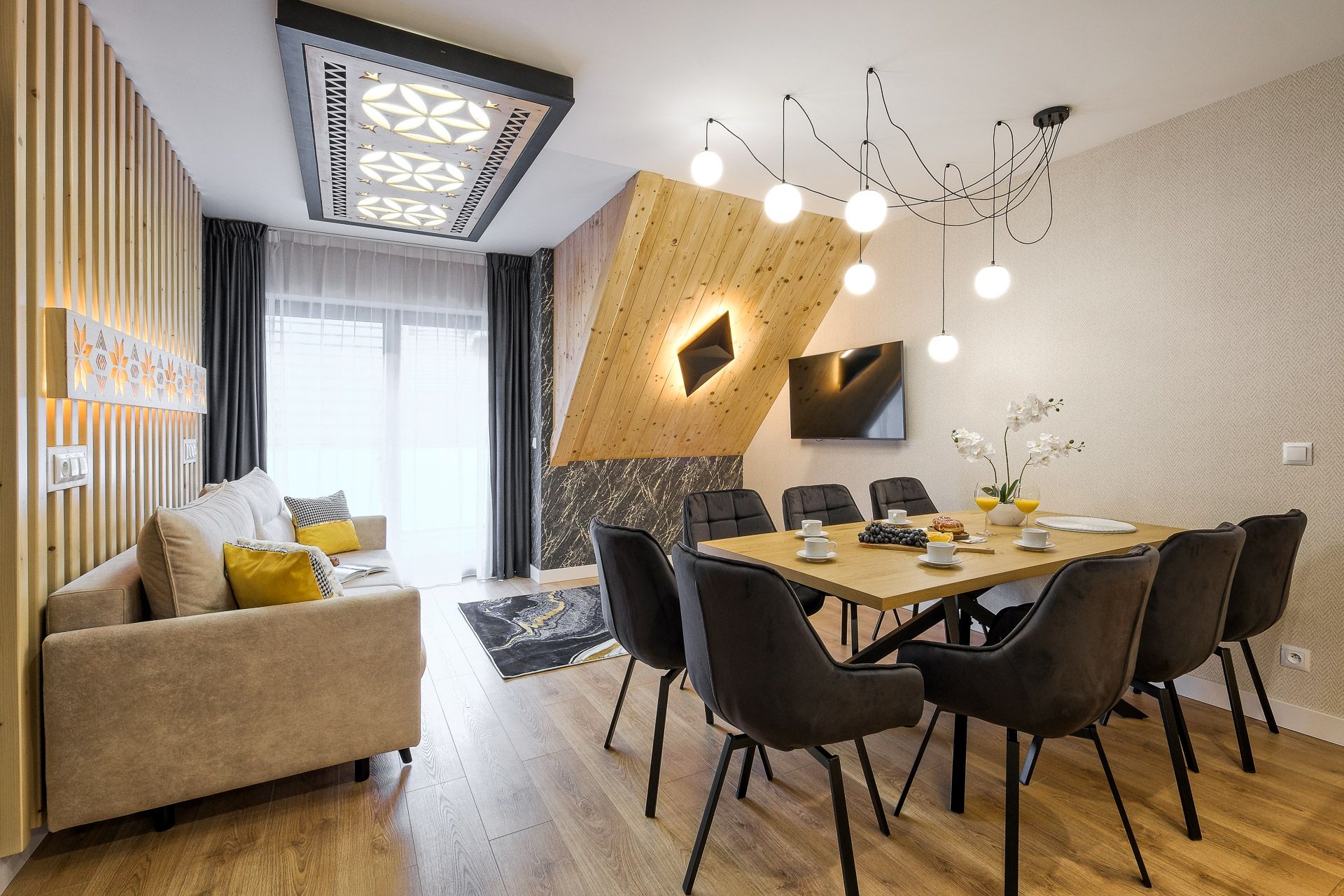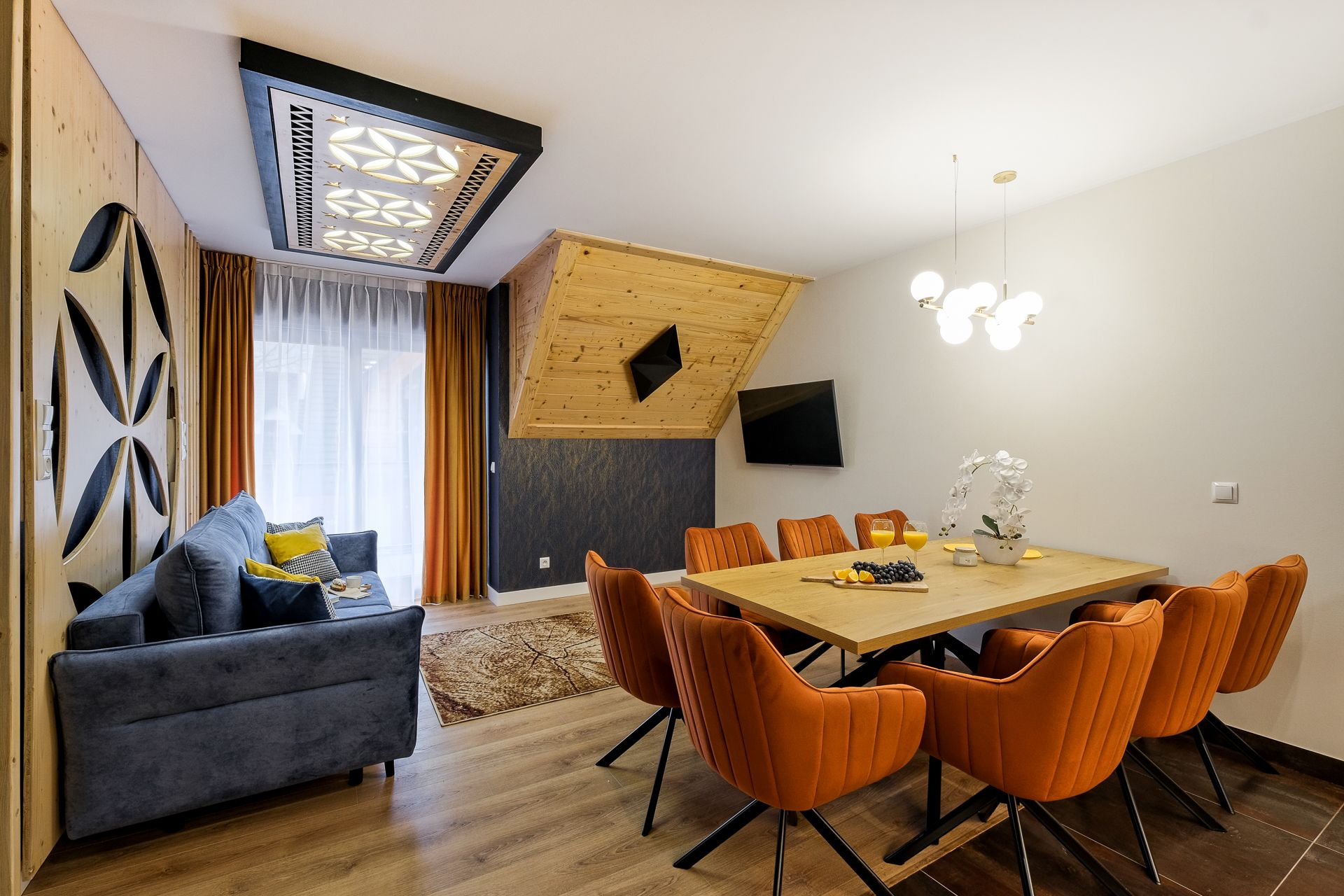Zapraszamy do przestronnego, nowoczesnego apartamentu stworzonego z myślą o komforcie rodzin oraz grup znajomych. Wnętrze łączy elegancki design, naturalne drewno i nastrojowe oświetlenie, tworząc wyjątkową atmosferę sprzyjającą wypoczynkowi o każdej porze roku. Apartament mieści maksymalnie 8 osób.