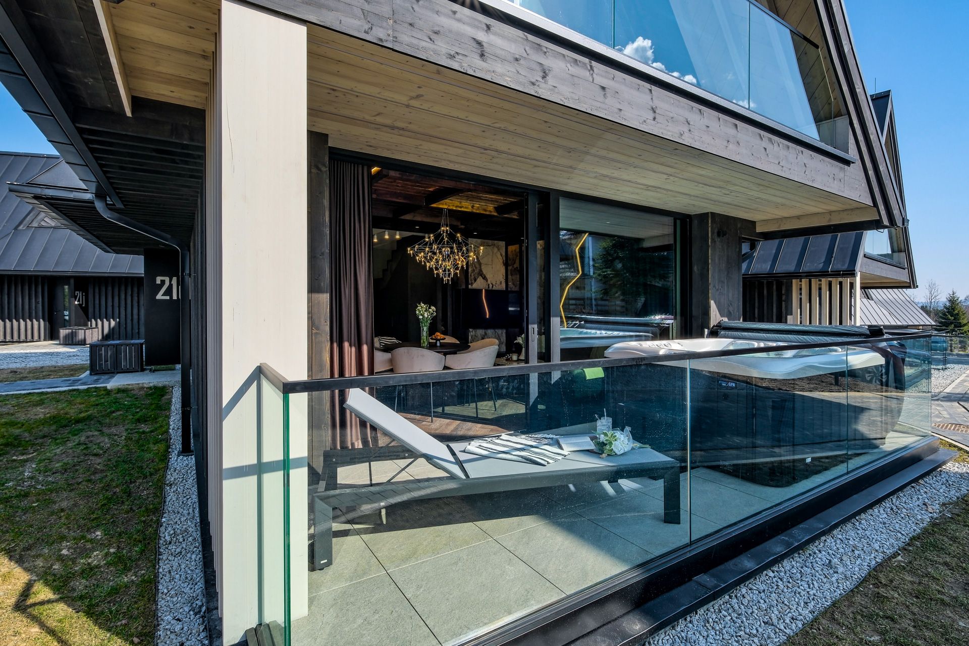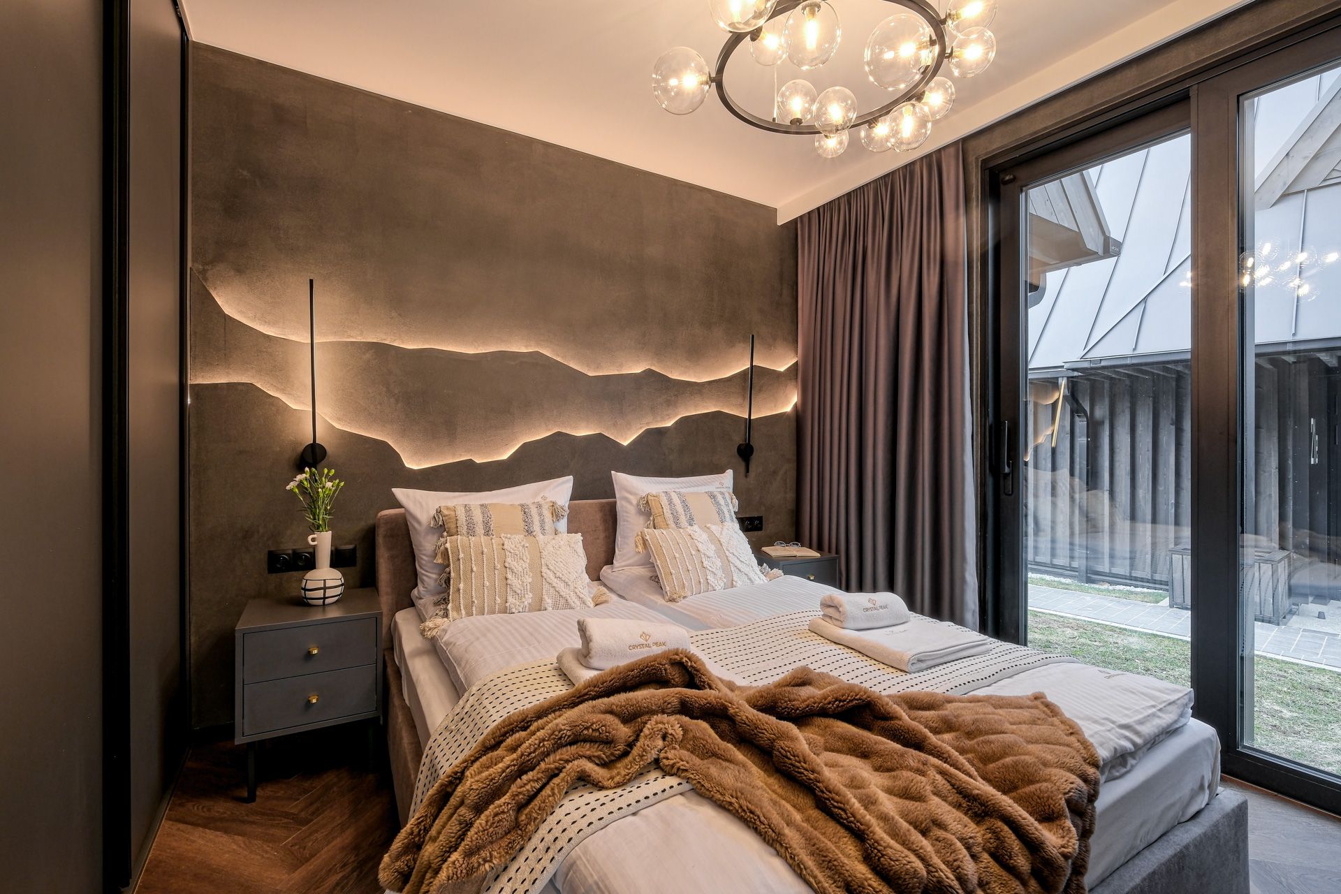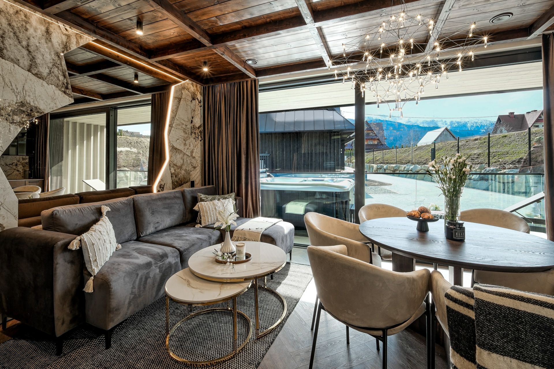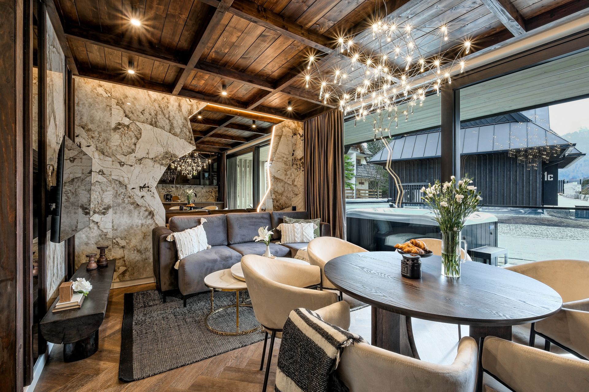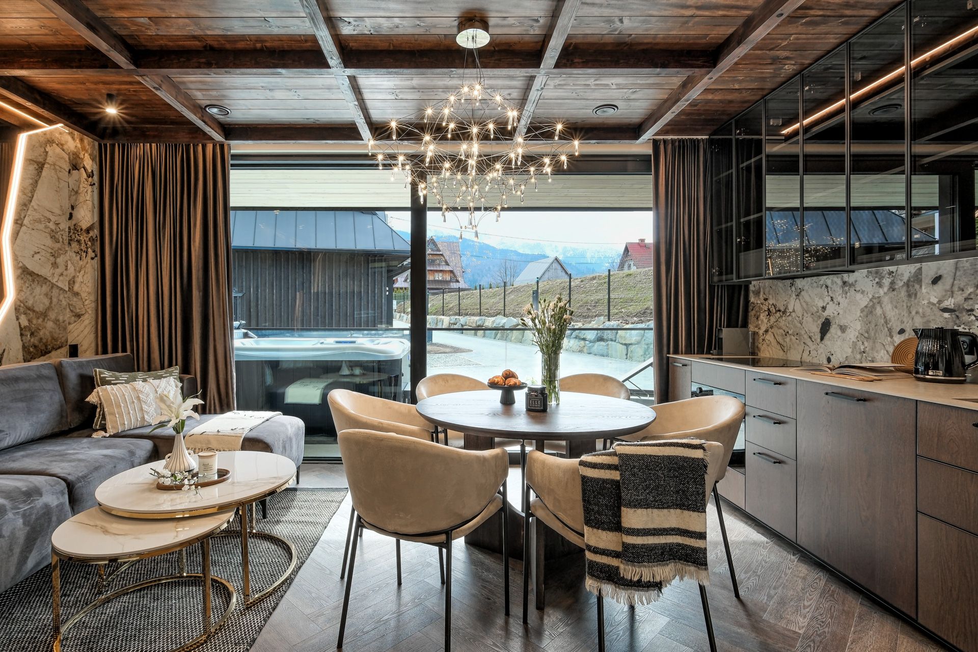 Nowoczesne wnętrza łączą naturalne drewno, kamień oraz designerskie elementy wykończenia, tworząc wyjątkowy klimat luksusowego wypoczynku w górach.