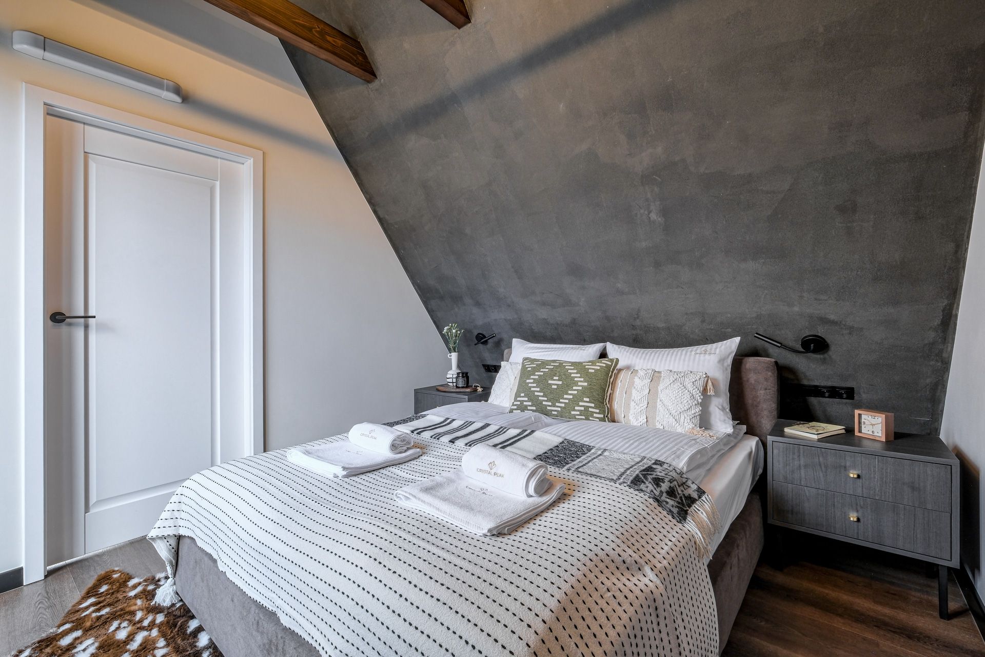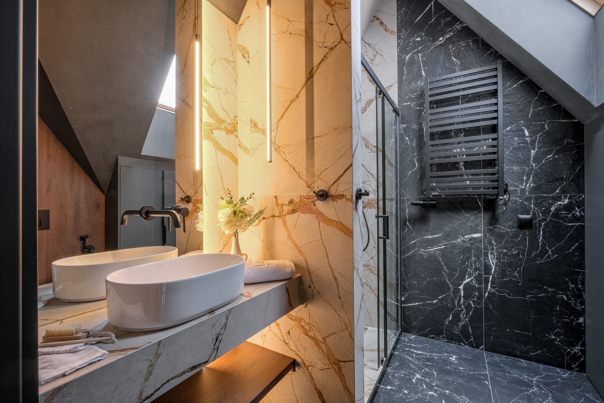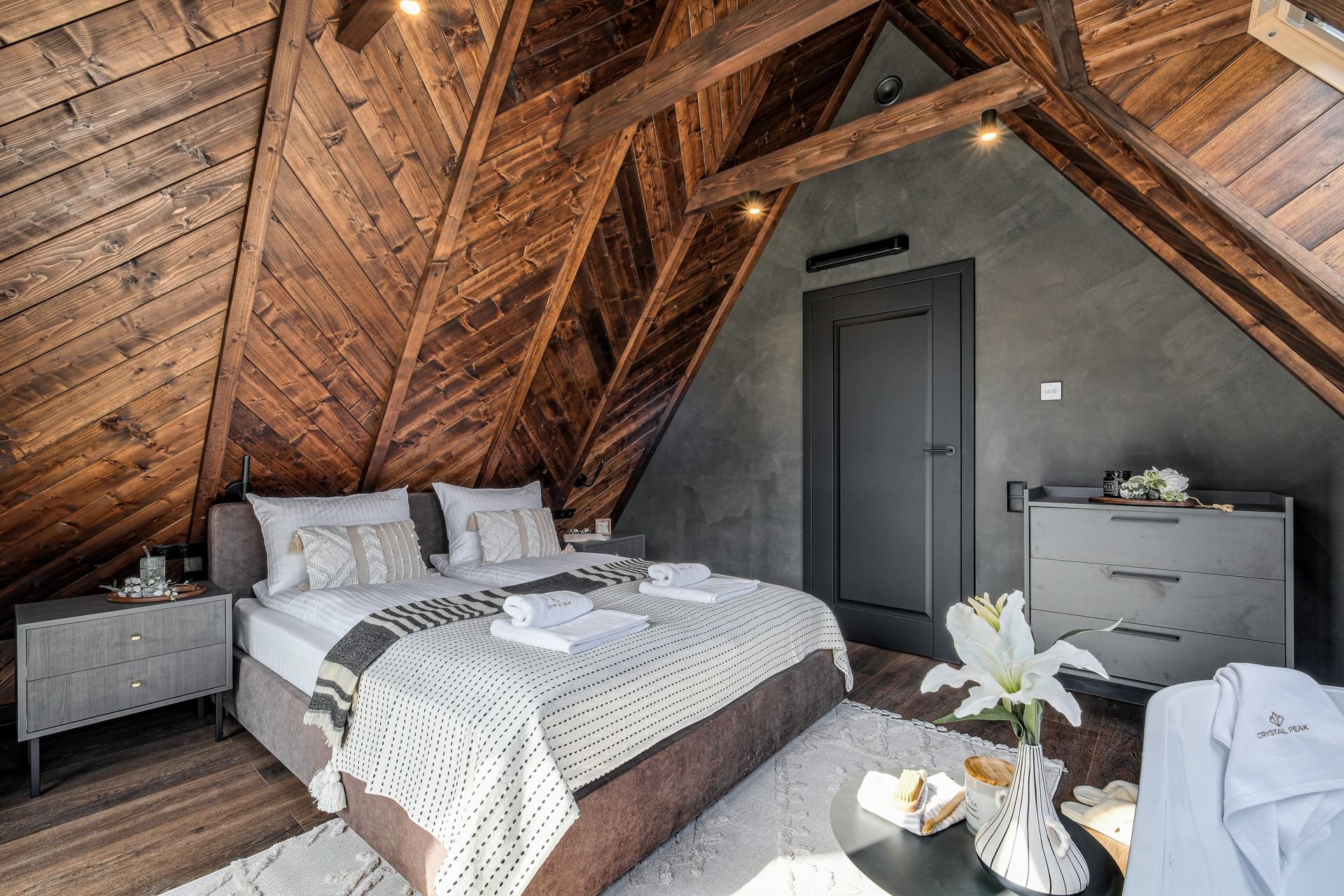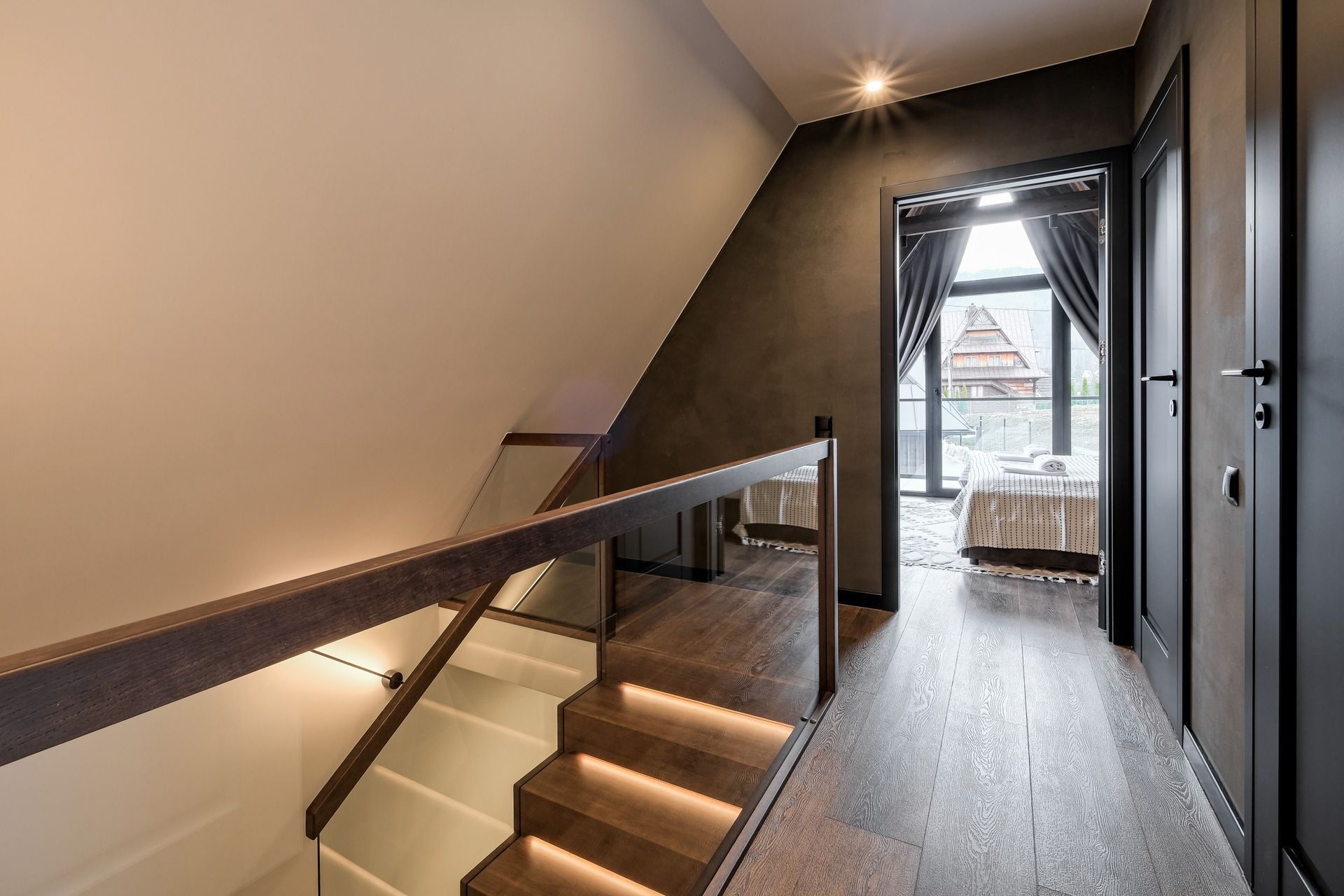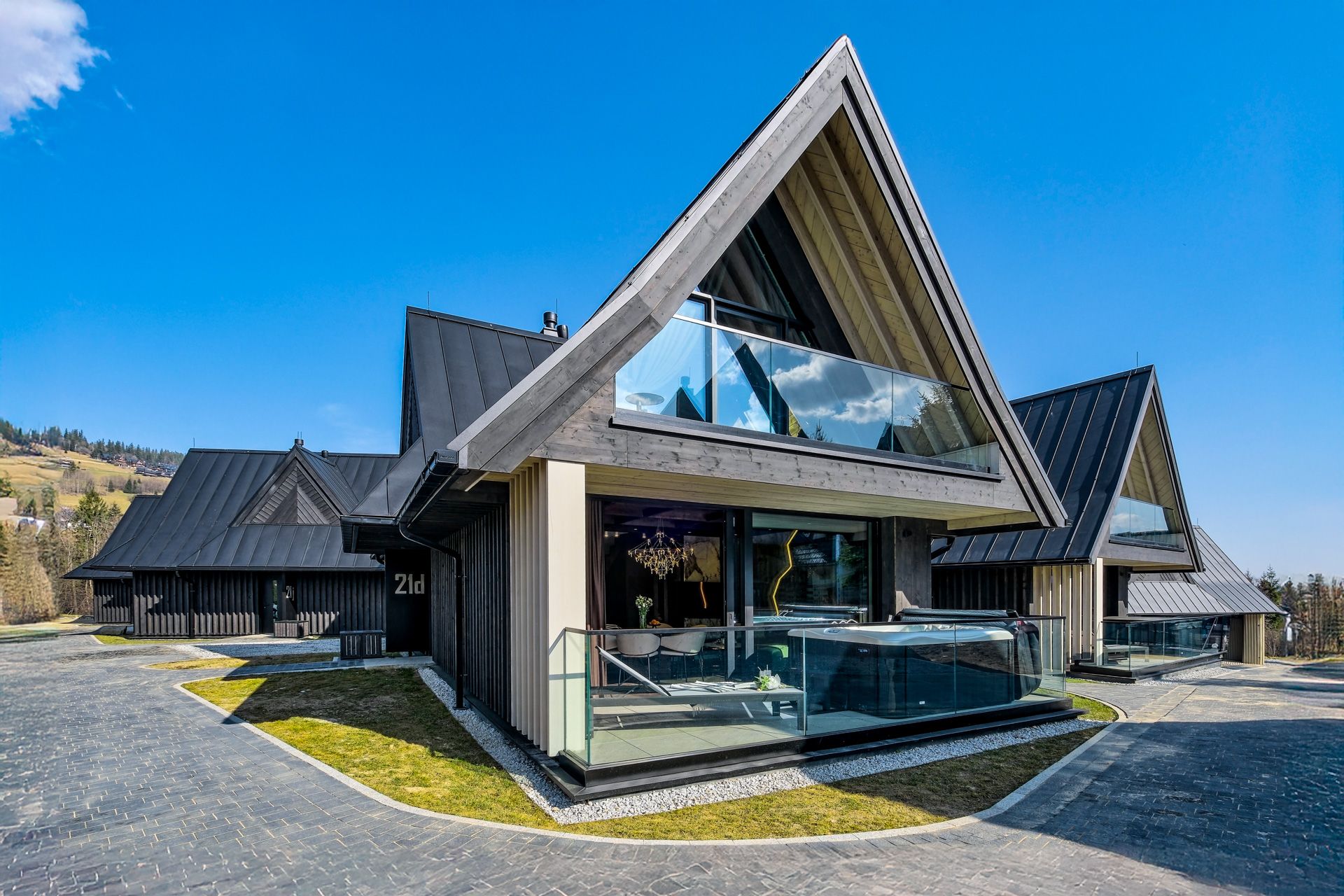 Nowoczesne wnętrza łączą naturalne drewno, kamień oraz designerskie elementy wykończenia, tworząc wyjątkowy klimat luksusowego wypoczynku w górach.
