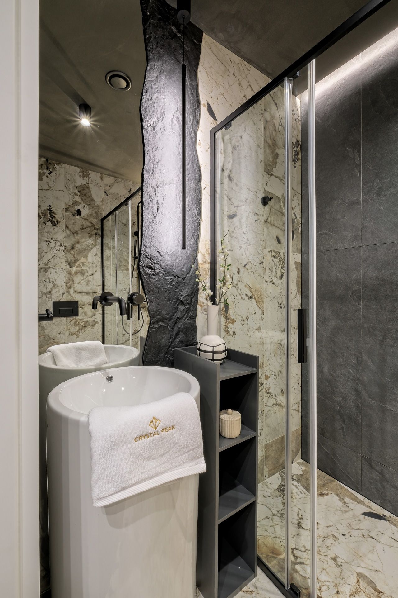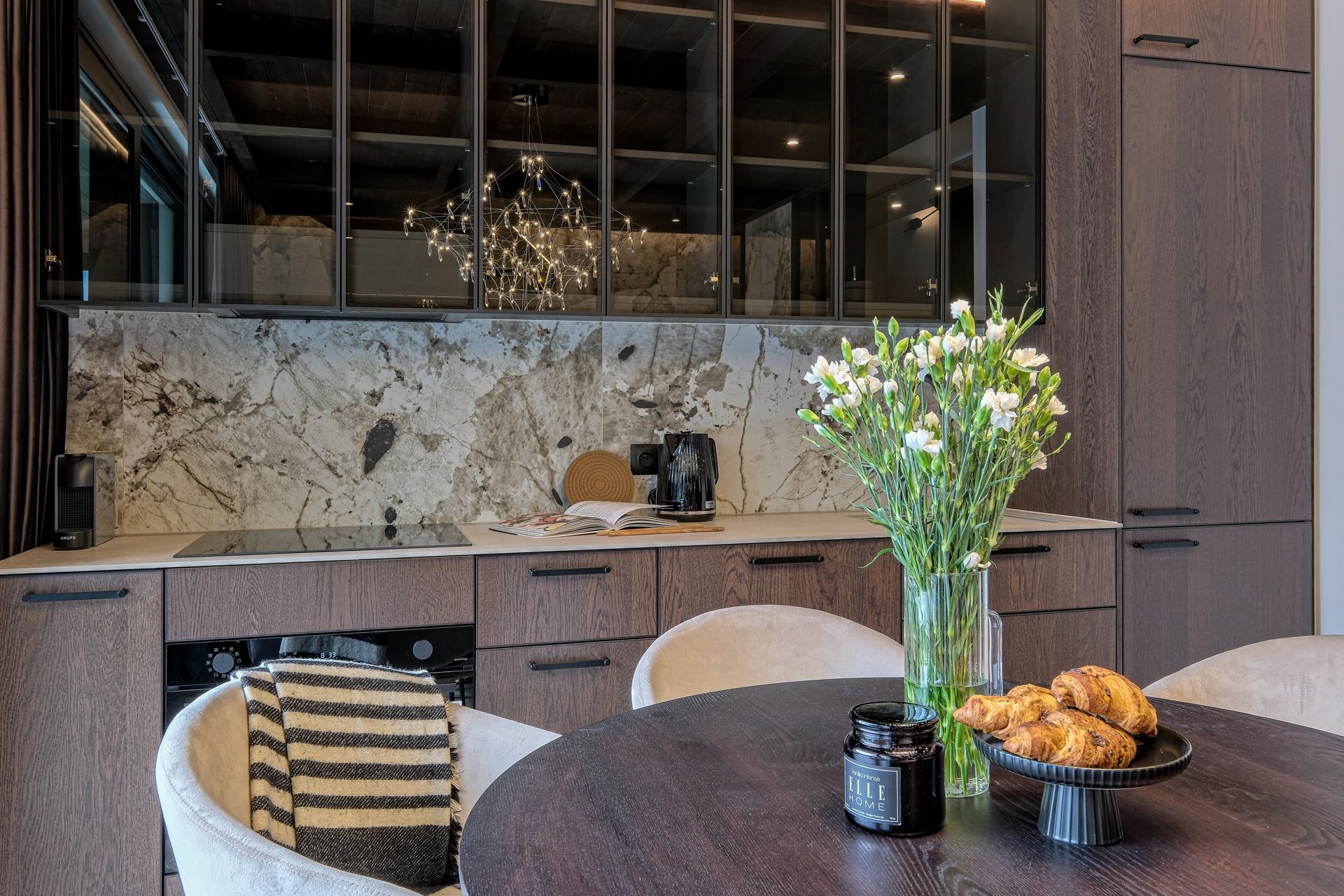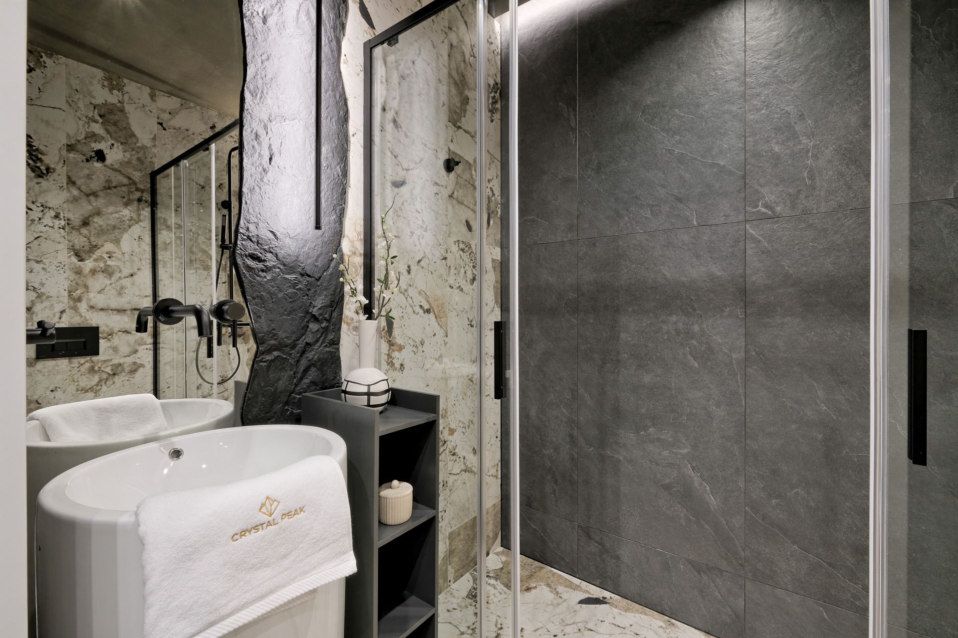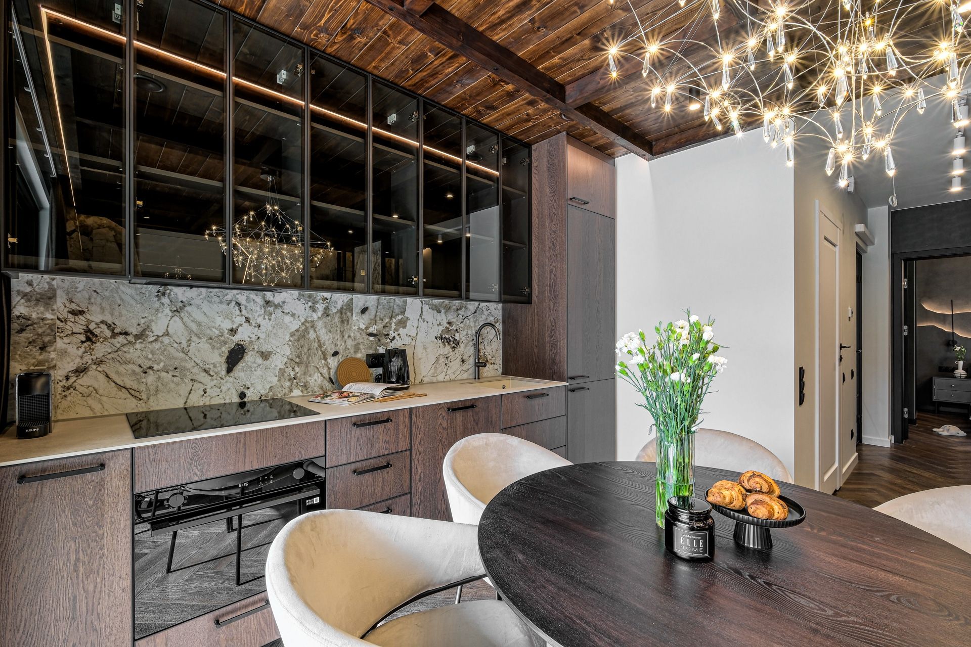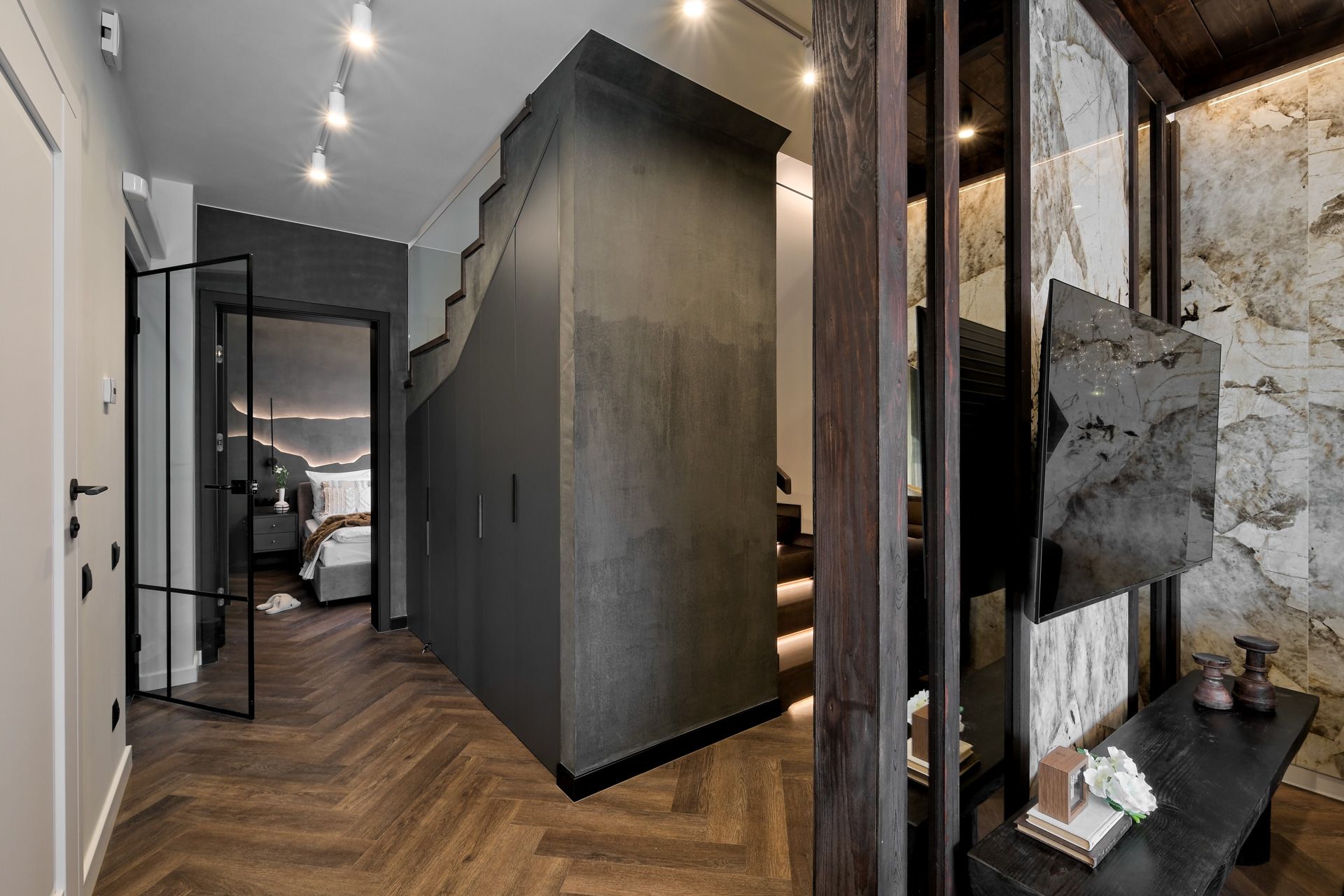 Nowoczesne wnętrza łączą naturalne drewno, kamień oraz designerskie elementy wykończenia, tworząc wyjątkowy klimat luksusowego wypoczynku w górach.