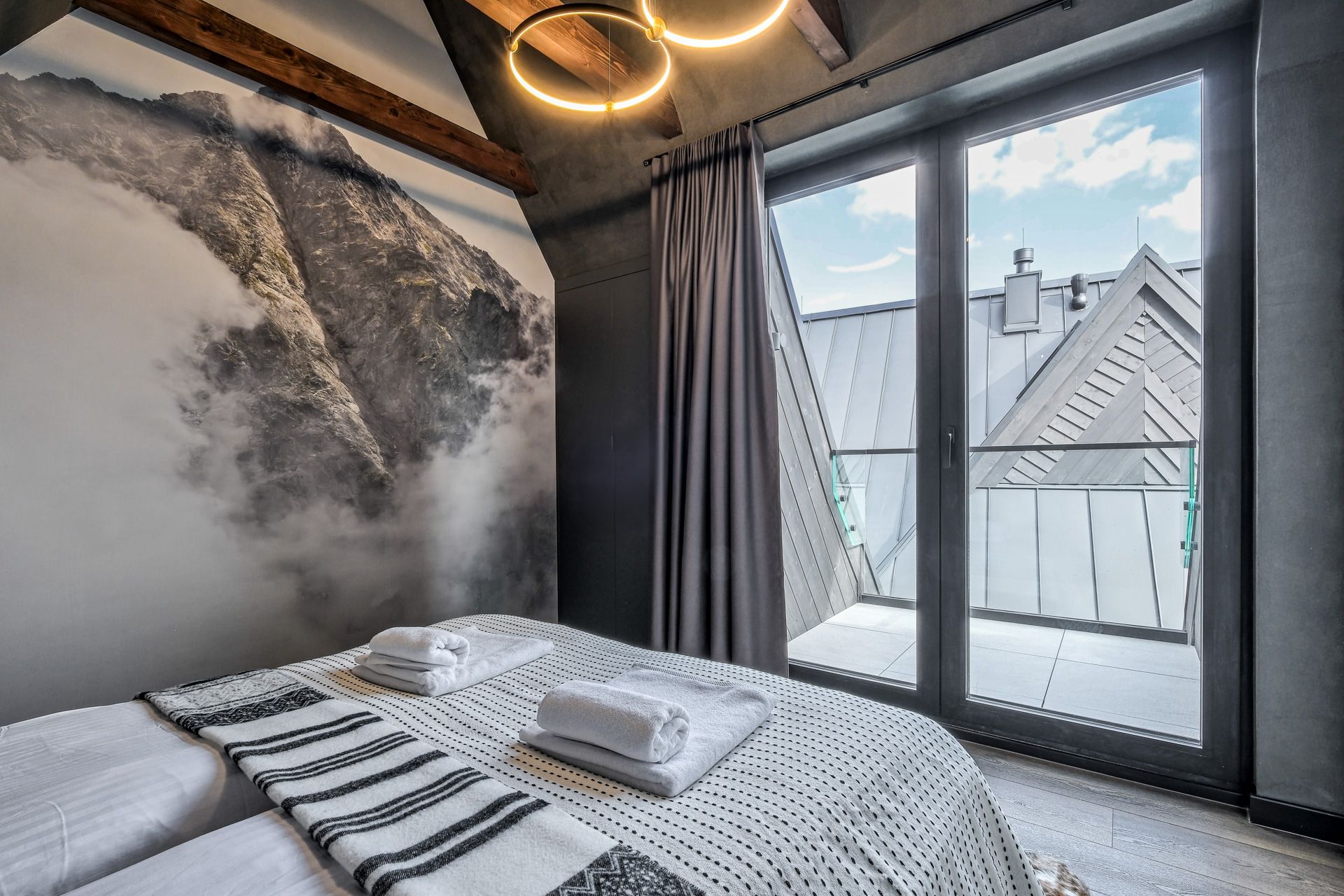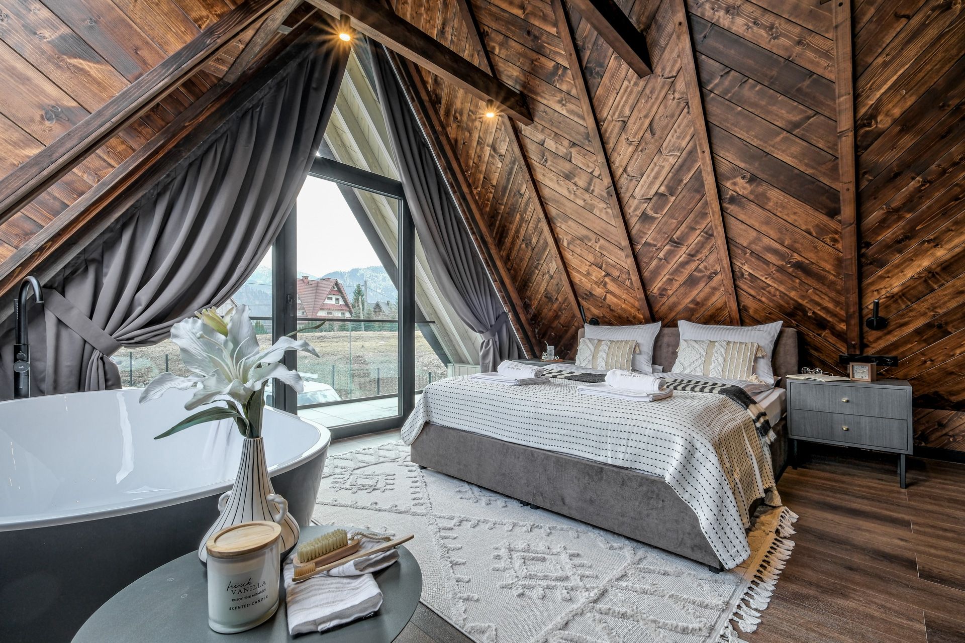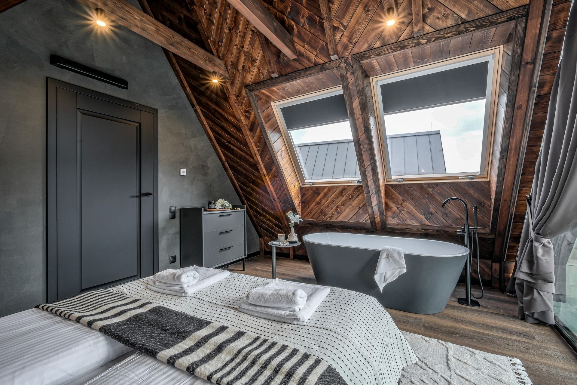 • jedna z sypialni na piętrze posiada wolnostojącą wannę przy panoramicznym oknie z widokiem na Tatry