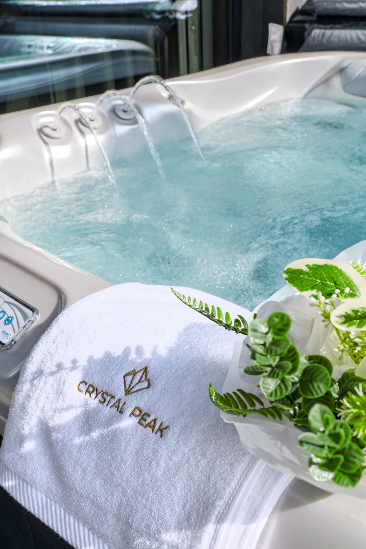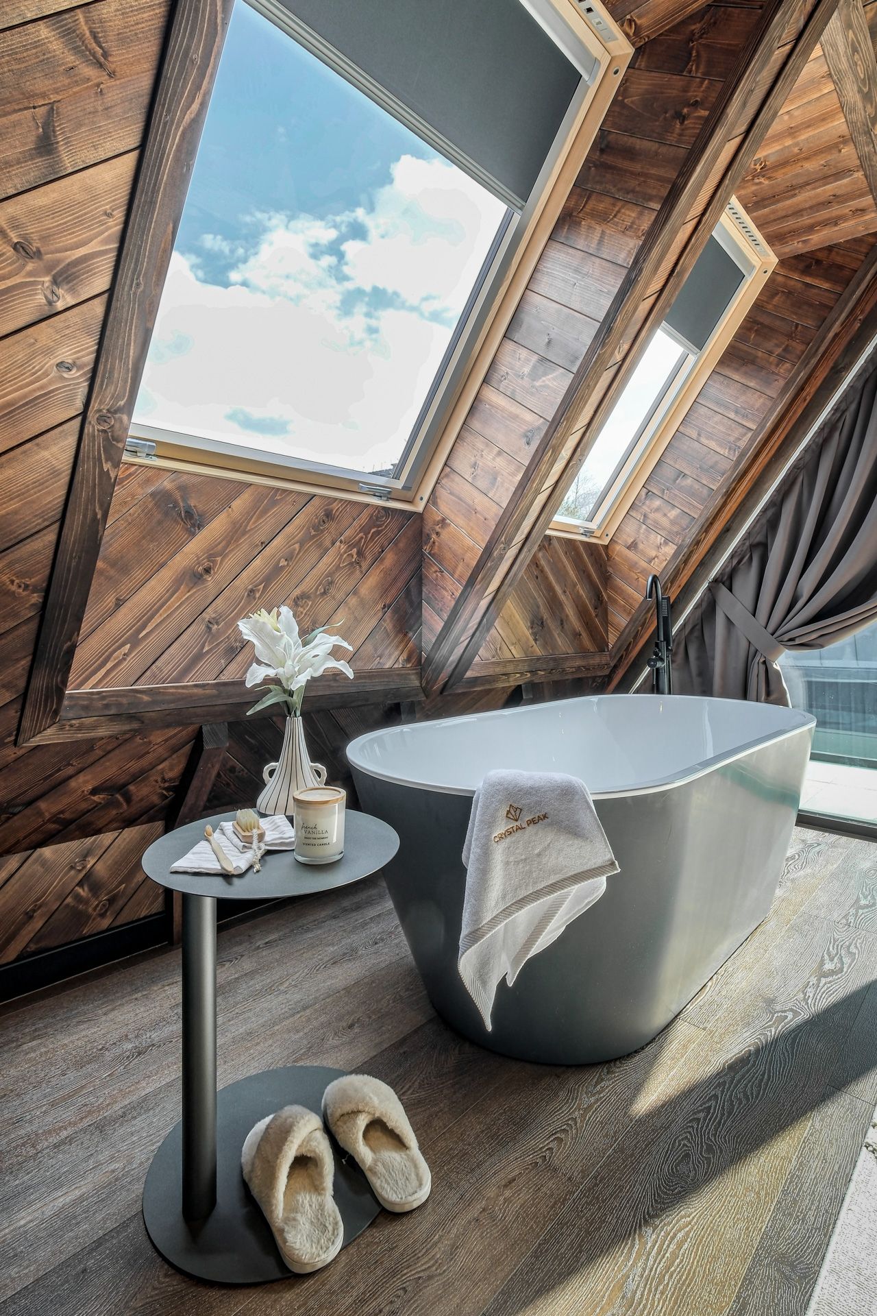 Relaks w wannie z widokiem na Tatry to wyjątkowe doświadczenie, które sprawia, że pobyt w Crystal Peak Villas & Spa staje się jeszcze bardziej niezapomniany.