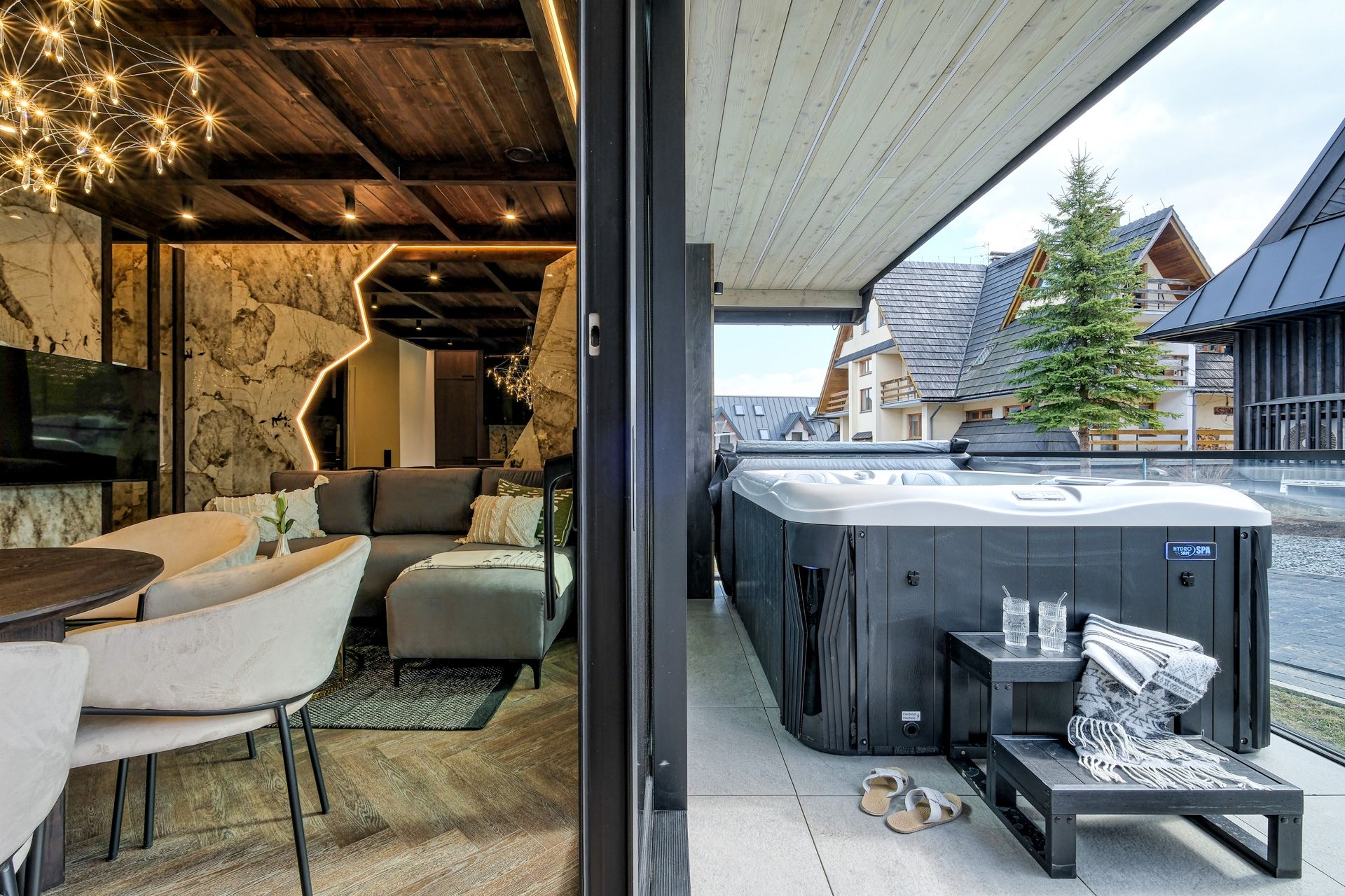 Największym atutem domku jest prywatne jacuzzi na tarasie, które pozwala zrelaksować się po dniu spędzonym na górskich szlakach lub stokach narciarskich.