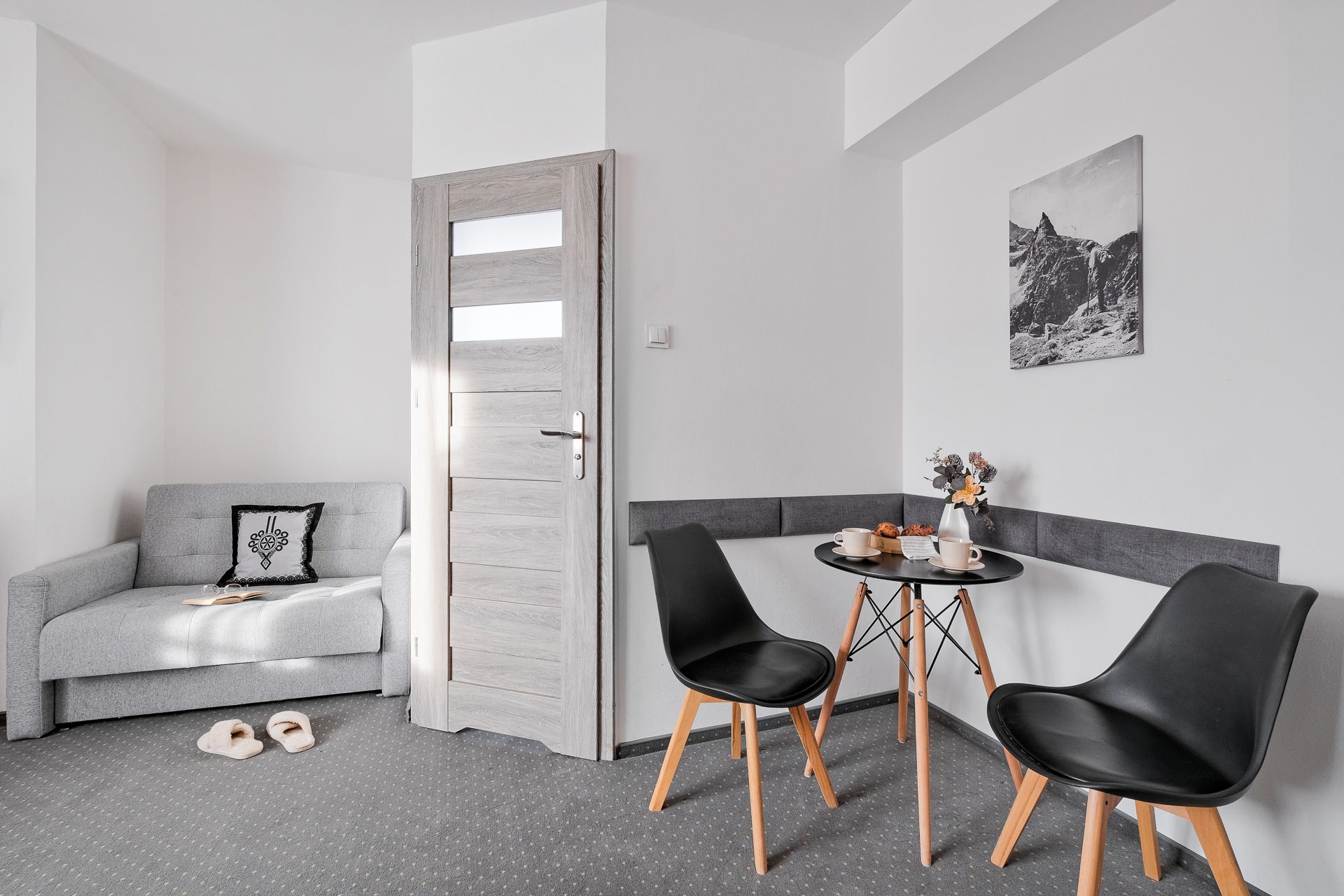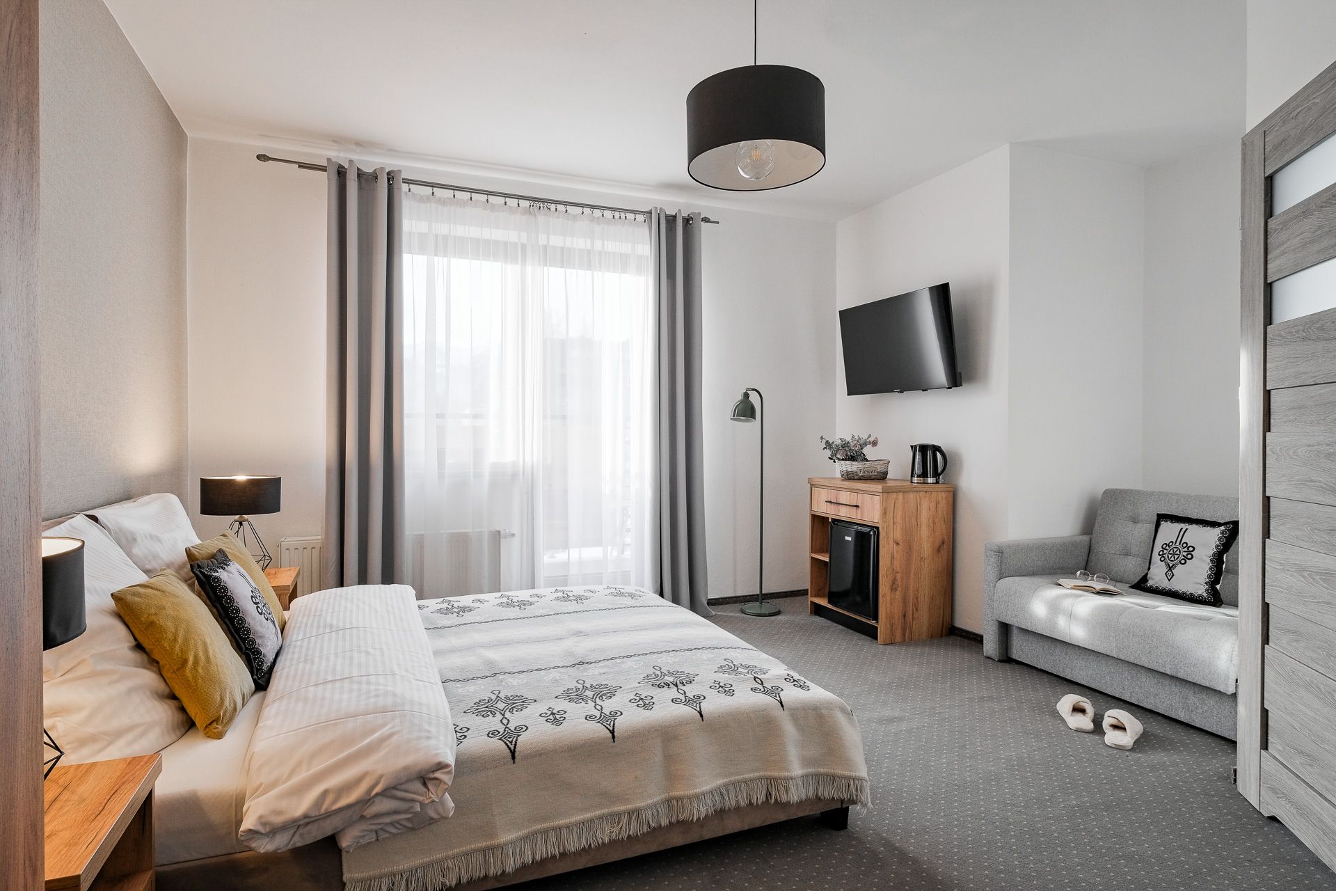 Jasny pokój z balkonem i widokiem na Tatry. Wygodne łóżko małżeńskie, dodatkowo mała rozkładana sofa, stolik z dwoma krzesłami, TV, czajnik i mini-lodówka. Nowoczesna łazienka z prysznicem i oknem. Idealny dla par lub 2 osób szukających spokoju i górskich panoram.