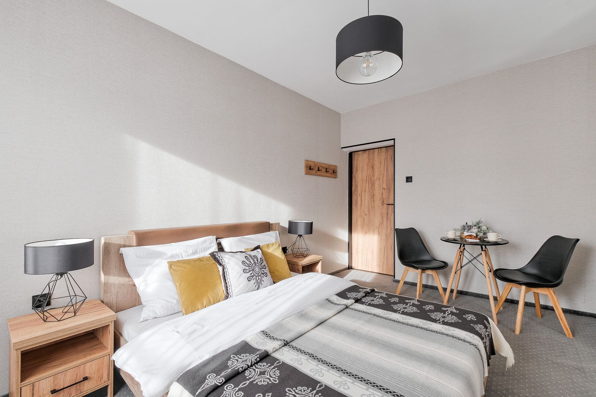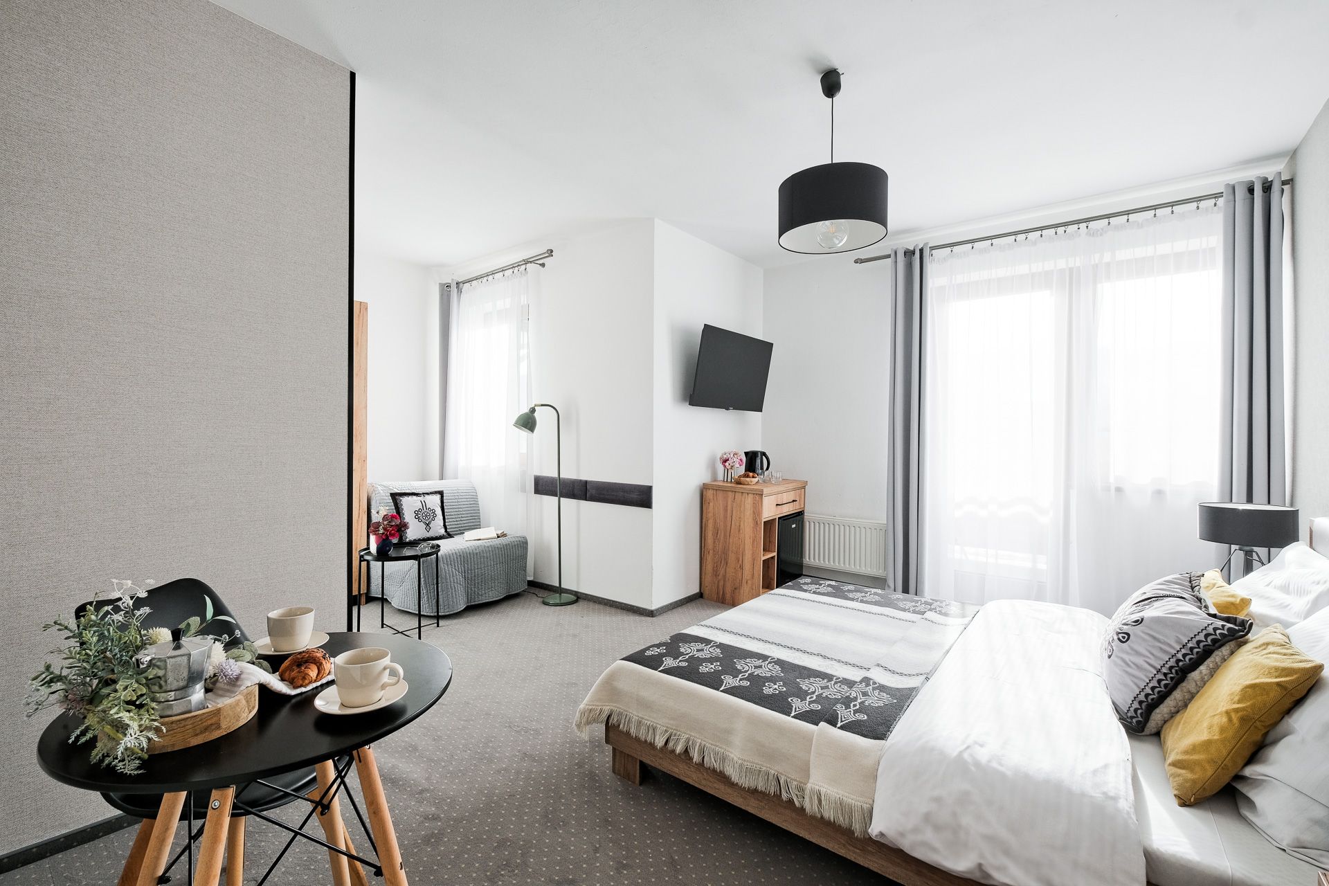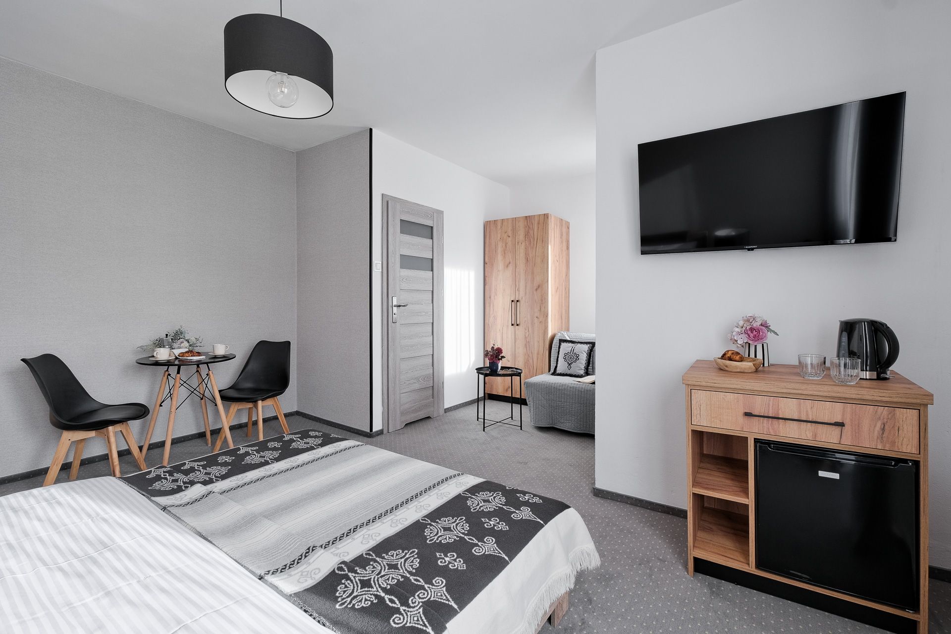 Przestronny pokój 3-osobowy z balkonem i widokiem na góry. Wygodne łóżko małżeńskie ( 160 cm) + rozkładana sofa , stolik z krzesłami, TV, czajnik i mini-lodówka. Nowoczesna łazienka z prysznicem. Idealny dla par, małej rodziny lub na dłuższy, komfortowy pobyt.