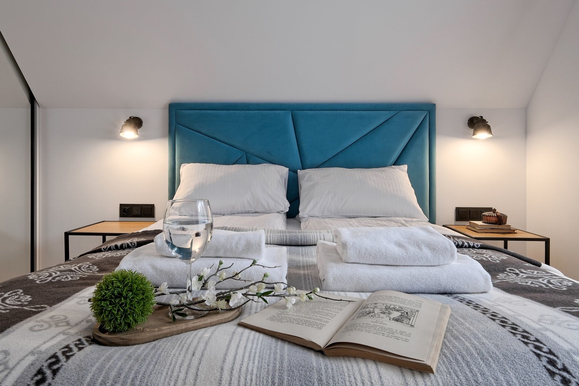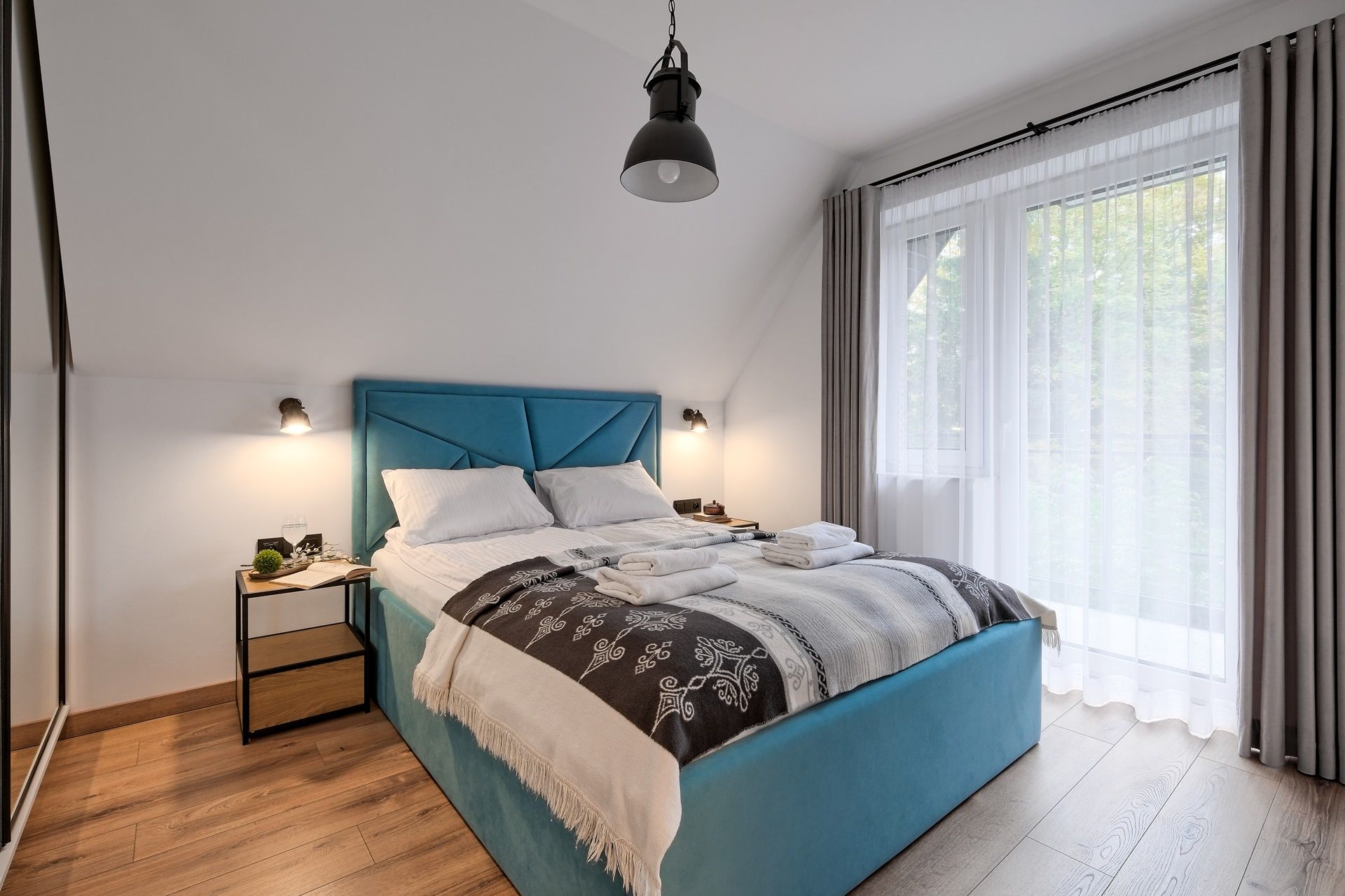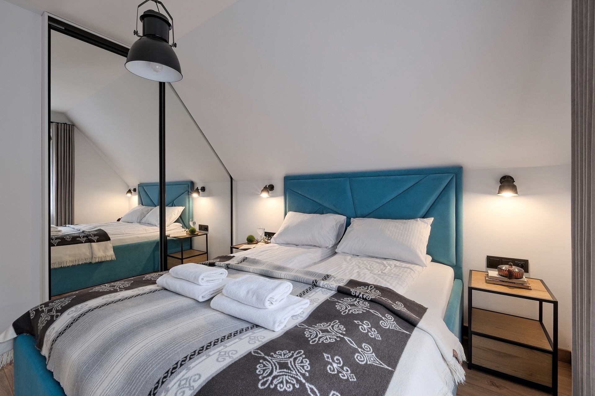 Apartament TURKUS o powierzchni 45 m² z prywatnym wejściem, idealny dla 2–4 osób. Składa się z jasnego salonu z rozkładaną sofą, oddzielnej sypialni z dużym łóżkiem małżeńskim oraz nowoczesnej łazienki z prysznicem, zestawem kosmetyków, ręcznikami i suszarką do włosów.